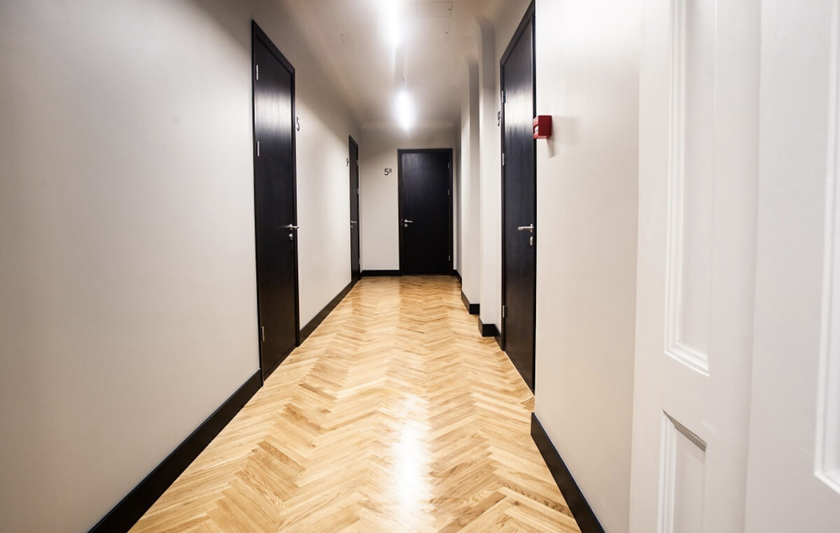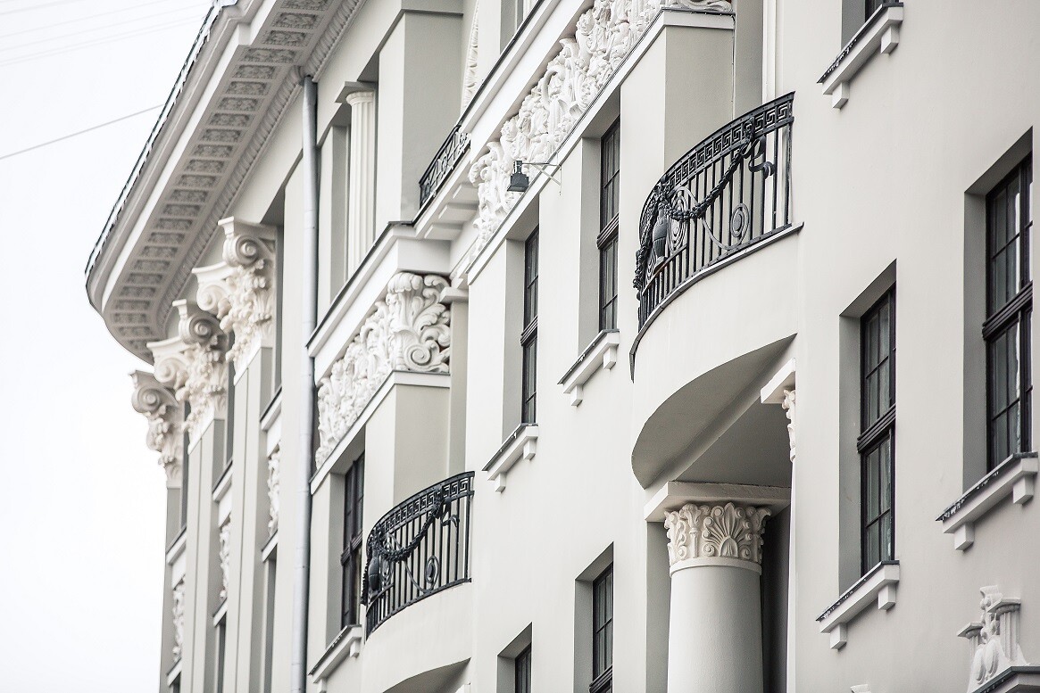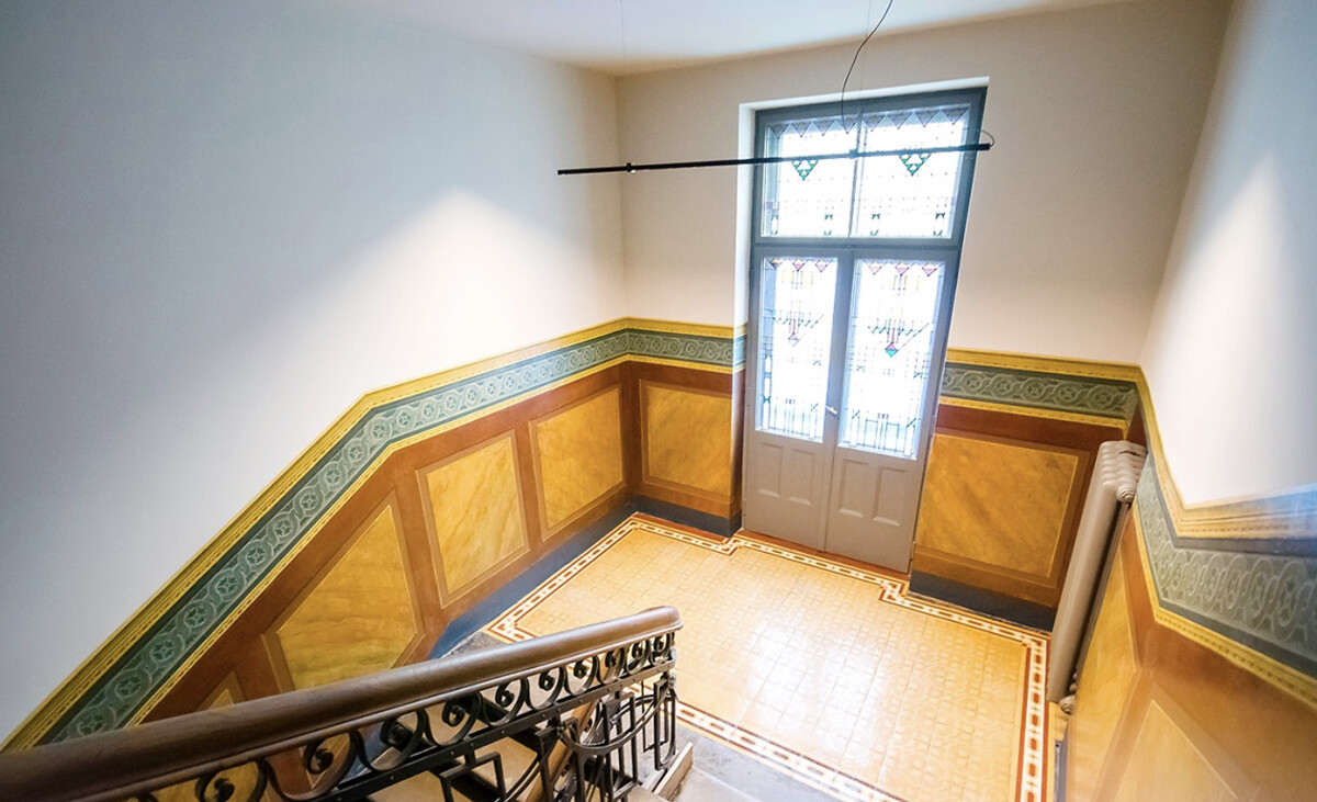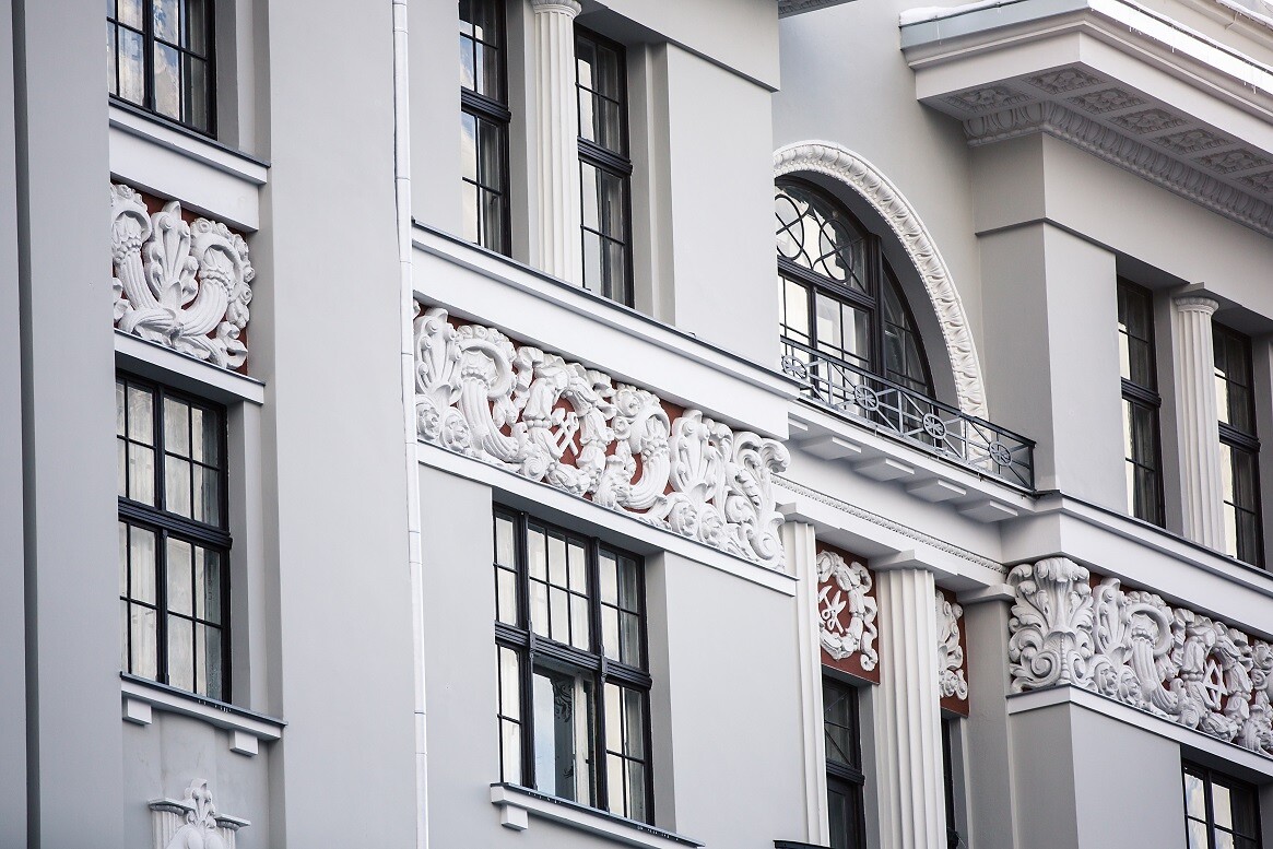 izgaismotas vēsturiskās fasādes, veikta dzīvokļu pārplānošana, kāpņu
