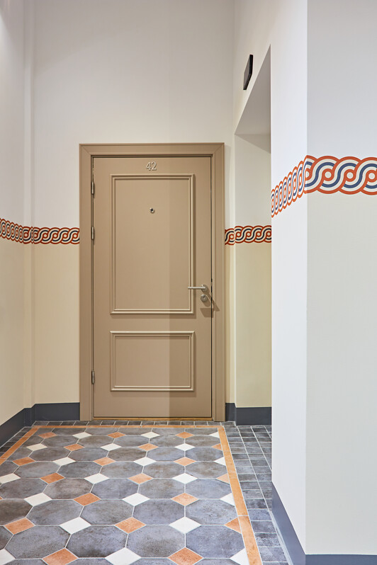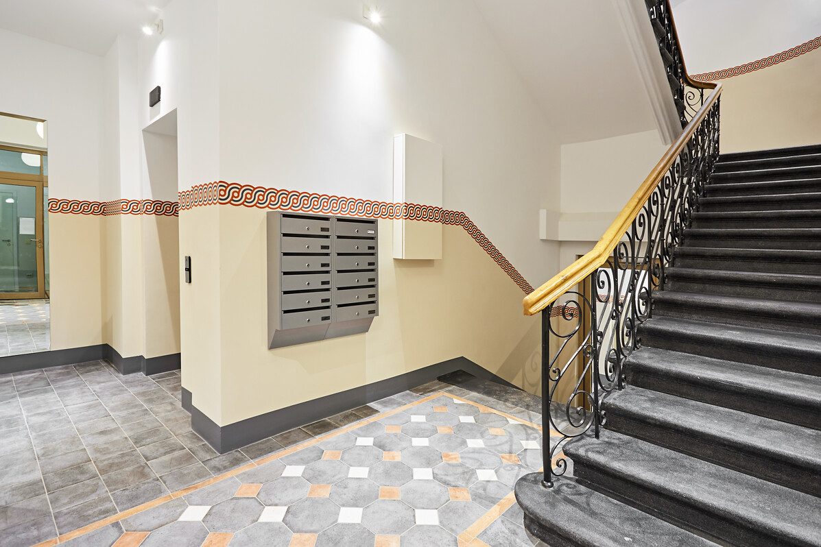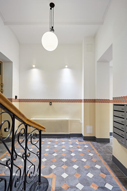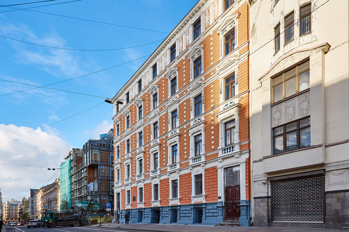 fasādes, kāpņu telpas un greznās parādes ieejas.