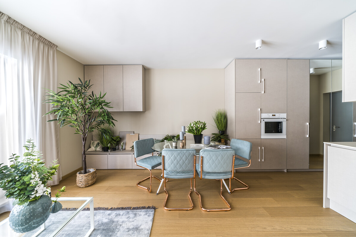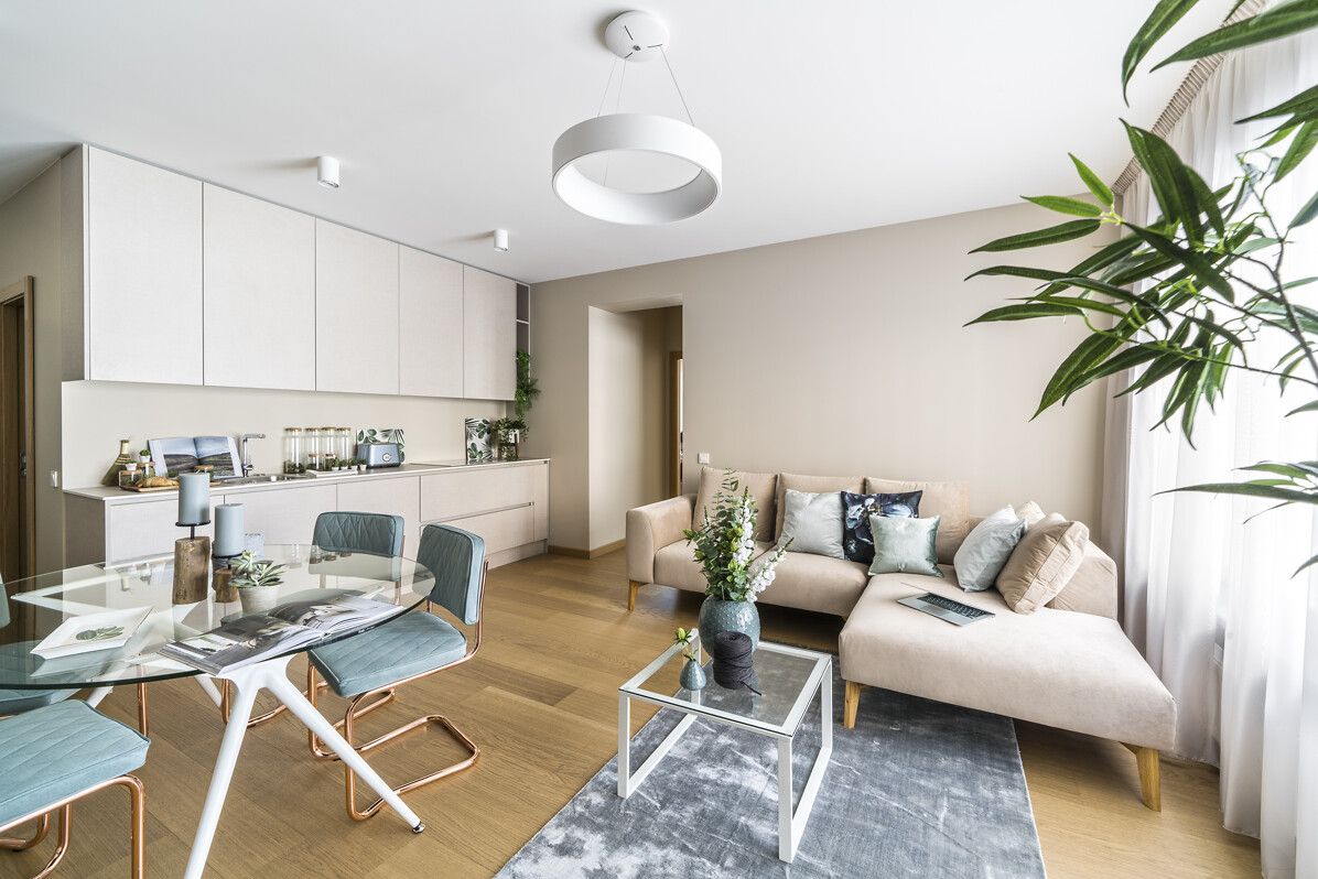 Dzīvokļu dažādajiem plānojumiem ir sagatavoti arīinterjera dizainera ieteikumi. Attīstītāji izvēlējušies labākās kvalitātes un dizaina mēbeles un interjera priekšmetus, kas ražoti Latvijā. Apdarē ir izmantoti ilgtspējīgi, izturīgi, ekoloģiski un augstākās kvalitātes dizaina materiālino uzticamiem ražotājiem un kompānijām, kas pierādījuši sava produkta kvalitāti un spēju tehnoloģiski attīstīties.
