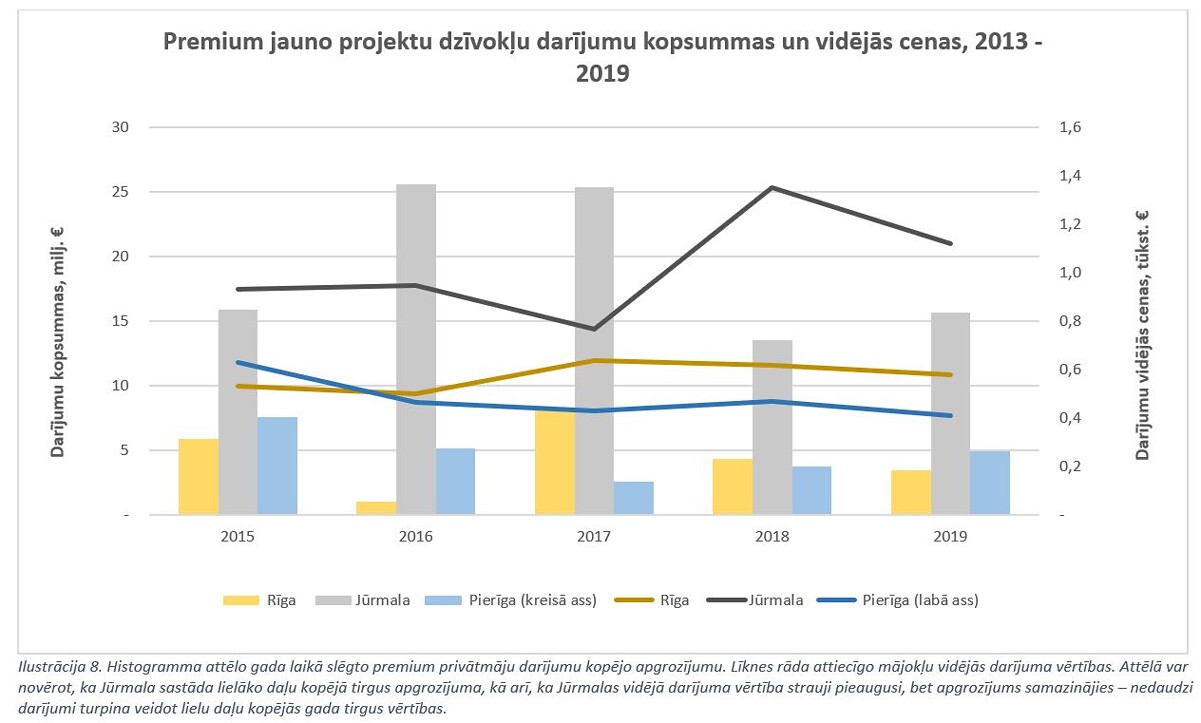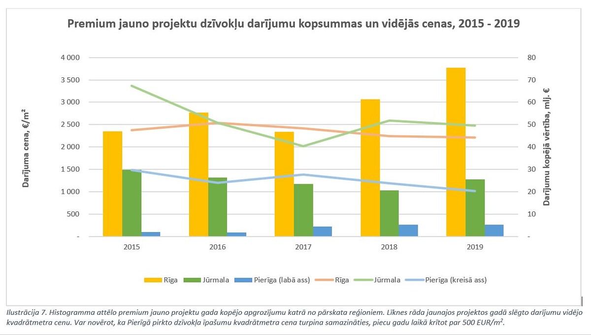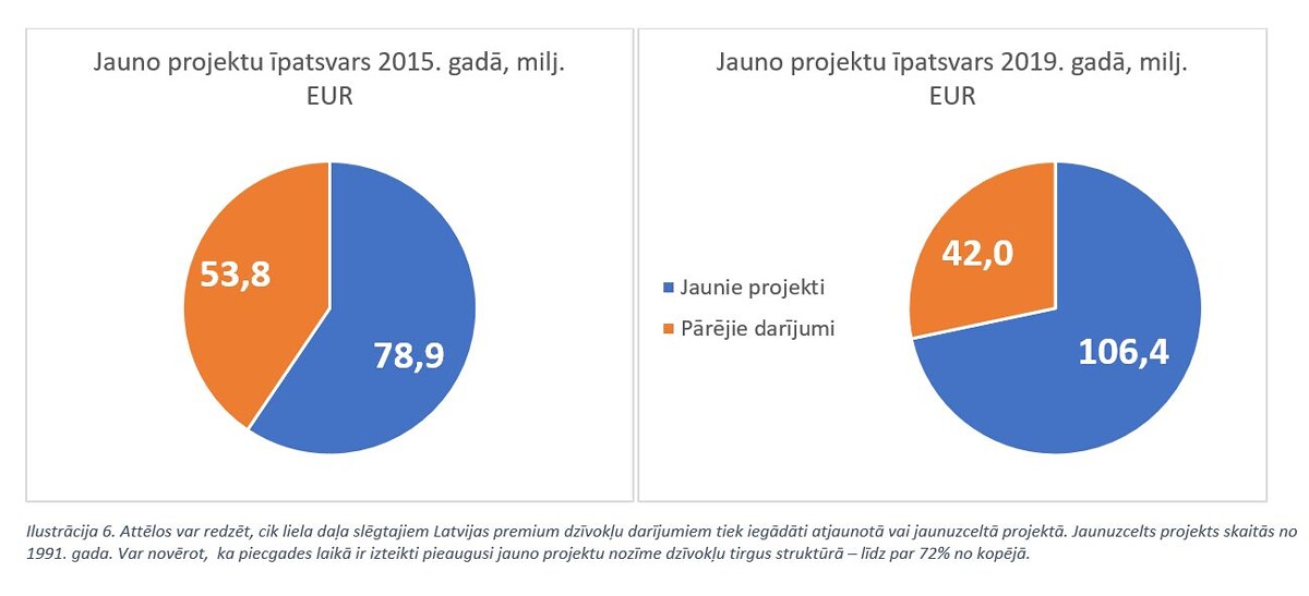 Jauno projektu daļa no kopējā premium dzīvokļu tirgus sasniedza 70 % īpatsvaru. Pieprasījums pēc dzīvokļiem jaunās un atjaunotās ēkās pieauga par 19.1 milj. eiro  līdz 106.4 milj. eiro. Palielinoties jauno projektu skaitam, vidējā kvadrātmetra cena turpina mēreni samazināties. Piemēram, Pierīgā sasniegta zemākā kvadrātmetra cena pēdējo piecu gadu laikā.