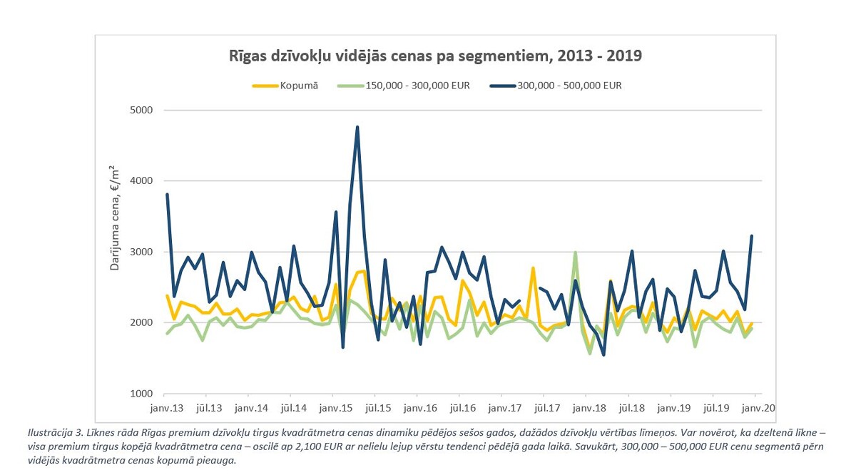 Rīgas premium dzīvokļu tirgus beidzot pārkāpis iepriekšējos piecos gados nepārvaramo 100 milj. eiro darījumu robežu. Pērn slēgto darījumu kopējā vērtība pieaugusi par 17.7 milj. eiro līdz 110.1 milj. eiro. Vienlaikus vērtības pieaugumam audzis arī darījumu skaits, sasniedzot  476 premium dzīvokļu pirkumus. Darījumu skaitam palielinoties straujāk nekā to vērtībai, vidējā Rīgā iegādātā dzīvokļa cena pērn nokritās par 7.4%, sasniedzot 2050 EUR/m2  jeb  230 000 eiro par dzīvokli. Analizējot premiumdzīvokļu darījumus pa cenu līmeņiem, var novērot, ka, lai arī t.s. pieejamajā 150 000 – 300 000 eiro cenu līmenī izmaiņas ir samērā mazas, tomēr 300 000 – 500 000 eiro vērto dzīvokļu līmenī vidējā kvadrātmetra cenā kopš