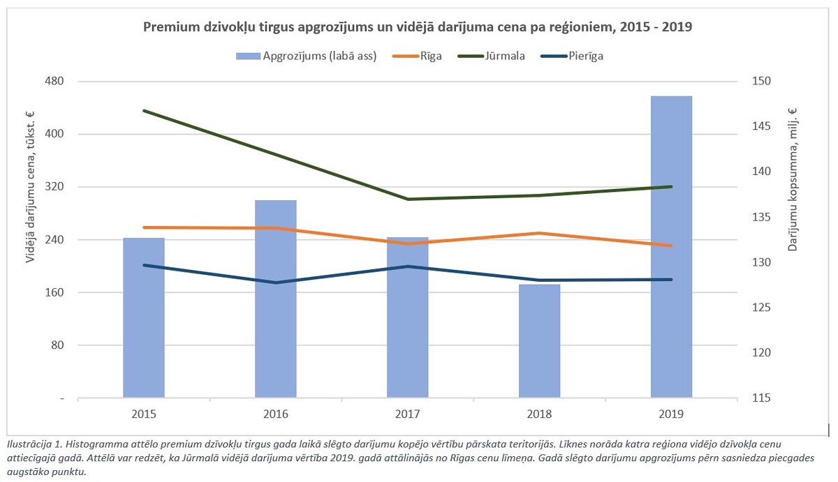 Latvijas premium īpašumu tirgus pērn - jaudīgākais pēdējo piecu gadu laikā - Nekustamo īpašumu ziņas - City24.lv nekustamo īpašumu sludinājumu portāls2019. gadā Latvijas trīs lielākie premium nekustamā īpašuma reģioni un trīs apskatītie tirgus segmenti atguvušies no 2018. gadā piedzīvotā krituma, un izaugsme bijusi pēdējo piecu gadu jaudīgākā. Darījumu kopējā vērtība visos trīs pārskata reģionos pieauga par 26.3 milj. eiro, un Rīgā veiktie darījumi veidoja vairāk nekā divas trešdaļas no kopējā apjoma. Rīgas premium tirgū  tika iegādāti 495 nekustamie īpašumi 118 milj. eiro vērtībā, kas bija par 19 milj. eiro jeb par 19.2% vairāk nekā gadu iepriekš. Jūrmalā pērn veikti 117 darījumi par kopējo summu 48.9 milj. eiro (pieaugums par 5 milj. eiro). Lai gan tas ir vairāk nekā 2018. gadā, pērnā gada darījumu kopējā vērtība kūrortpilsētābija par 15 milj. eiro mazāka nekā 2017. gadā. Līdzīgi kā Rīgā, arī Pierīgas reģiona premium nekustamā īpašuma tirgus 2019. gadābija pēdējo piecu gadu apjomīgākais. Šeit slēgti 59 darījumi 13.6 milj. eiro vērtībā, kas tirgu joprojām notur zem 10% no trīs reģionu kopējā apgrozījuma.