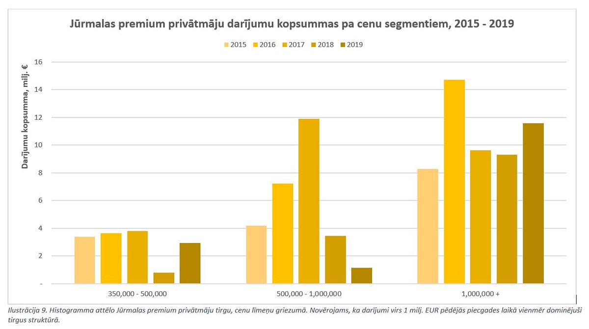 Arī Jūrmalā, kas premium privātmāju tirgū iepriekš „spēlējusi pirmo vijoli”, tirgus izaugsme nav bijusi spoža. Tāpat kā ar dzīvokļiem, arī privātmāju tirgus apgrozījums kūrortpilsētā 2019. gadā ir atrodams otrajā zemākajā punktā pēdējo gadu laikā, sasniedzot  15.7 milj. eiro apgrozījumu. To veidoja 14 darījumi, kas gan bija par 4 darījumiem un par 2.1 milj. eiro vairāk nekā gadu iepriekš. Vidēji pircējam nācies šķirties no 1.1 milj. eiro, lai savā īpašumā iegūtu premium privātmāju Jūrmalā, kas, salīdzinot ar iepriekšējo gadu, bija teju par 250 000 eiro lētāk. Iemeslus var skaidri novērot, analizējot darījumus pa cenu līmeņiem, kur vērojams trīskārtējs pieprasījuma pieaugums pieejamākajā tirgus segmentā, kur sasniegts 2.9 milj. eiro apgrozījums. Savukārt īpašumu grupā500 000 – 1 000 000 eiro vien divas mājas mainījušas īpašniekus. Arī piecas privātmājas vērtībā virs 1 milj. eiro ir atradušas sev jaunus īpašniekus, kopā izmaksājot 11.6 milj. eiro (pieaugums no 3 darījumiem 9.3 milj. eiro vērtībā 2018. gadā). Lai arī augstākais cenu segments jau otro gadu kāpis un atrodas četru gadu augstākajā punktā, šīs dinamikas ilgstoša turpināšanās nav sagaidāma Latvijas iedzīvotāju pirktspējas dēļ.