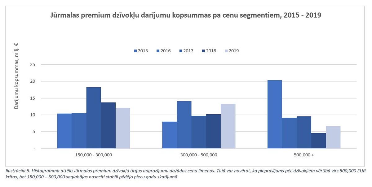 Jūrmalā100 premium dzīvokļi 2019. gadā piesaistījuši par 12% vairāk investīciju, veidojot 32.1 milj. eiro apgrozījumu. Tas bija par 3.5 milj. eiro un 7 darījumiem vairāk nekā 2018. gadā. Līdz ar to arī dzīvokļa vidējā vērtība nedaudz - par 4% - pieaugusi, sasniedzot  320 000 eiro vidējo cenu. Tomēr kopumā Jūrmalaspremium dzīvokļu tirgus joprojām nav atguvies no pēdējos gados pieredzētā, un atrodas vien mazliet virs tā zemākā punkta pēdējo 7 gadu laikā. 2019. gadā kūrortpilsētā darījumi ar cenu virs 300 000 eiro bija teju 2/3 no kopējā darījumu skaita. Apskatot darījumus detalizētāk, redzams 3 milj. eiro darījumu vērtības pieaugums 300 000 – 500 000 eiro vērto dzīvokļu cenu līmeņa segmentā un 2.1 milj. eiro darījumu vērtības pieaugums segmentā virs pusmiljona eiro.
