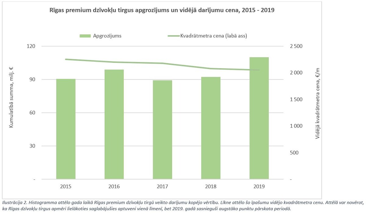 Latvijas premium nekustamā īpašuma tirgū 2019. gadā novērojams  pieaugums gan darījumu skaitā, gan to kopējā vērtībā, sasniedzot augstāko izaugsmes punktu kopš 2014. gada. Pērn kopumā premium tirgū noticis 671 darījums par kopējo summu 180.6 milj. eiro, kas bija par 26.3 milj. eiro vairāk jeb par 15 % lielāka tirgus aktivitāte nekā gadu iepriekš.