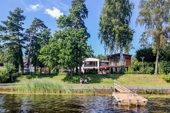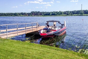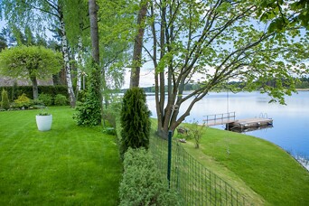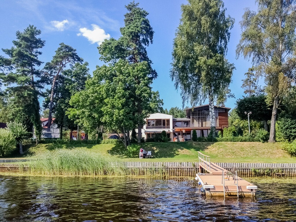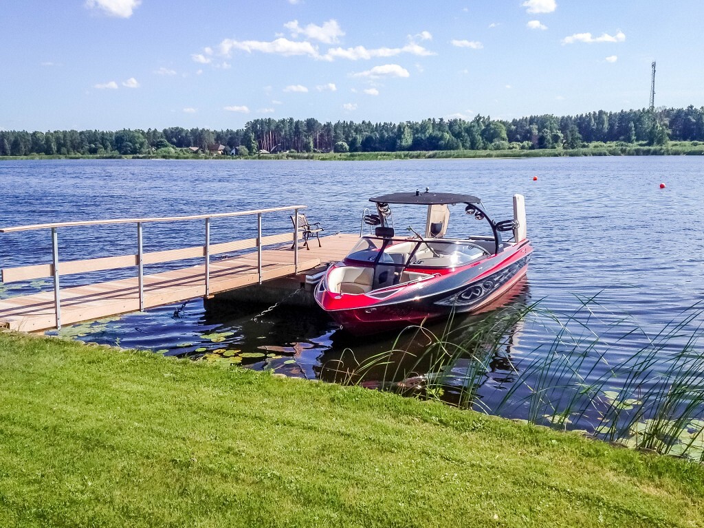 iekoptās piekrastes ar laipu un laivu piestātni, gan