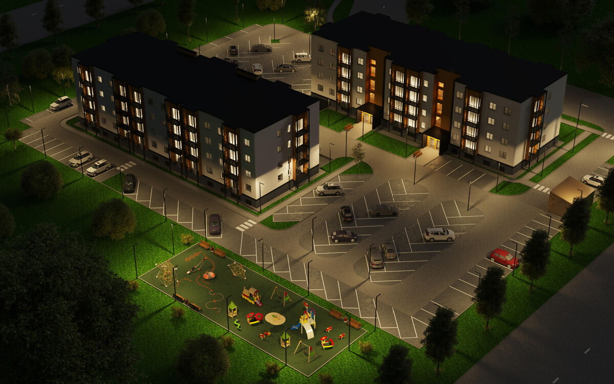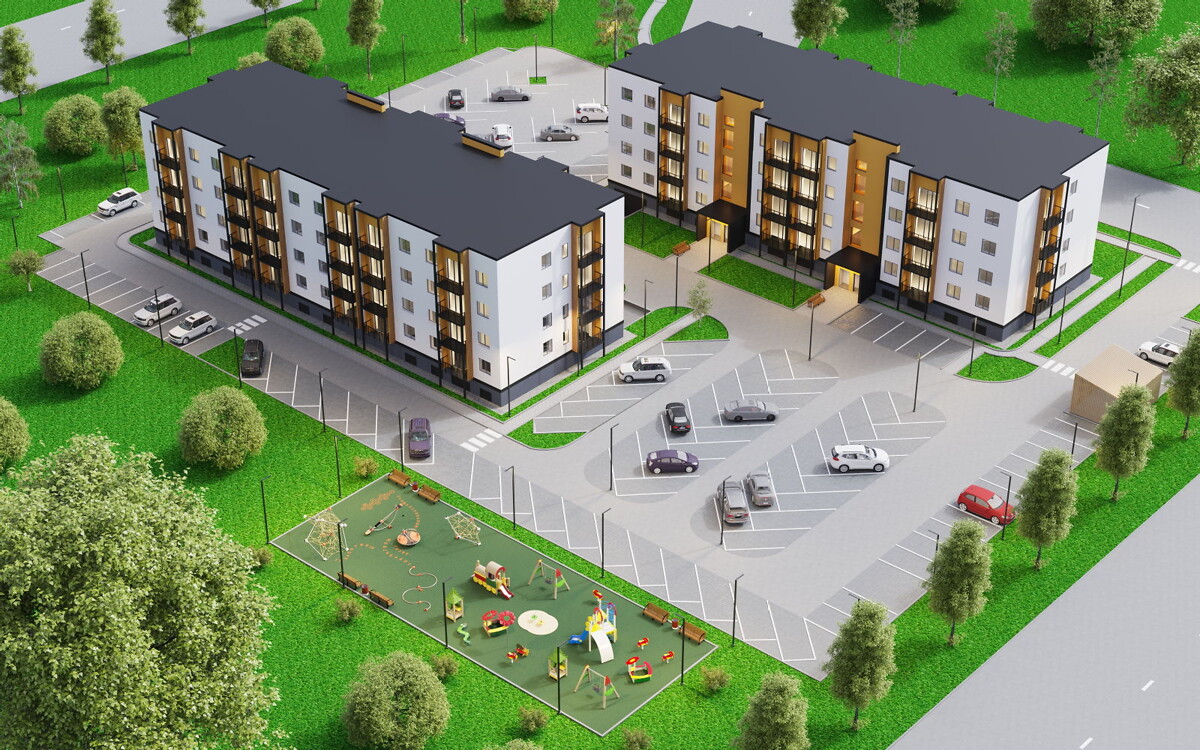 Projekts tiks realizēts divās kārtās, pirmajā celtniecības kārtā uzbūvējot divas četru stāvu ēkas ar 48 dzīvokļiem katrā un pazemes un virszemes autostāvvietu. Projektā otrajā kārtā paredzētas uzcelt vēl divas, līdzīgas ēkas.