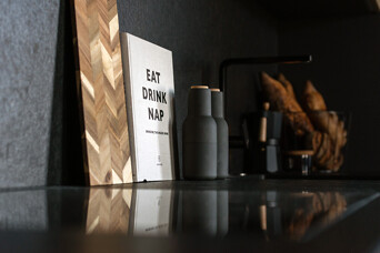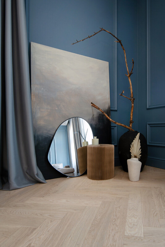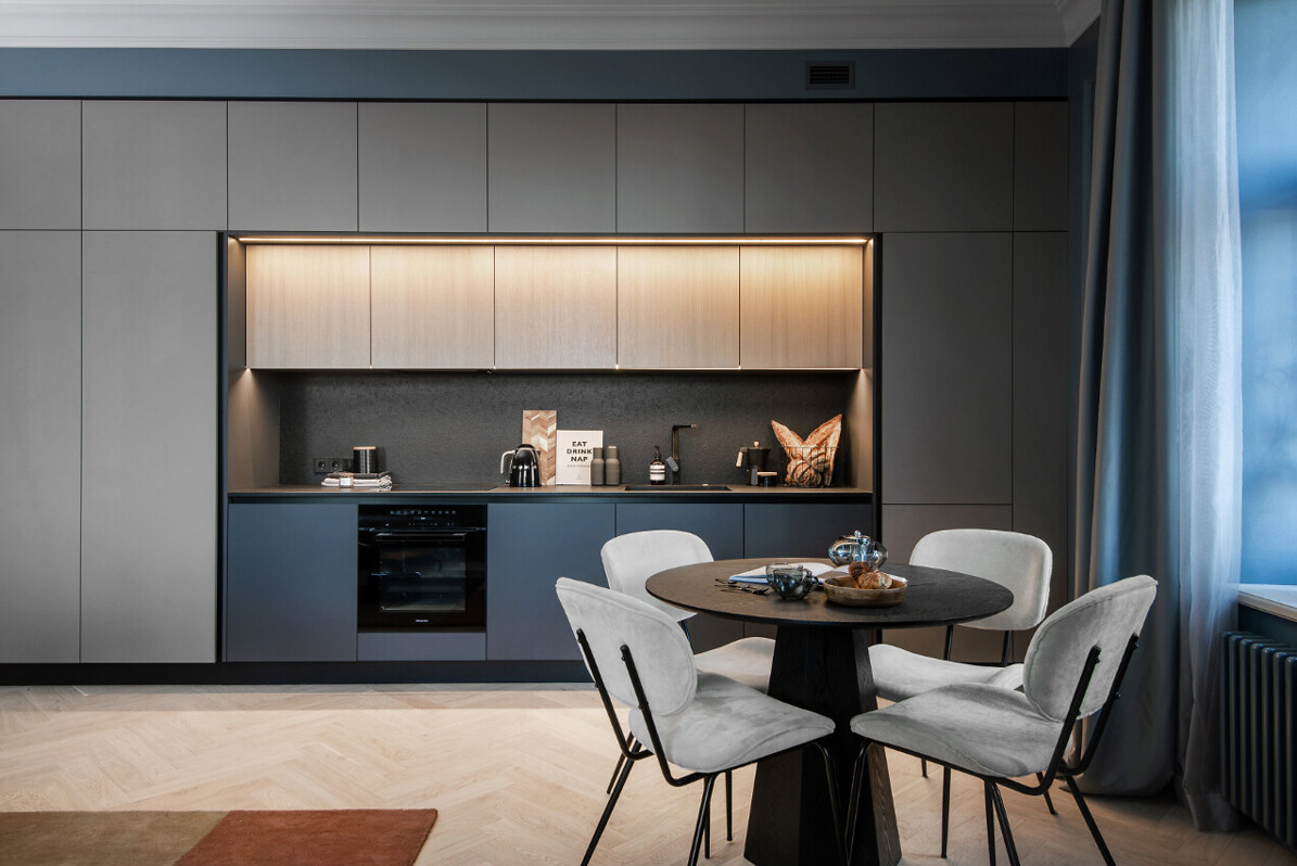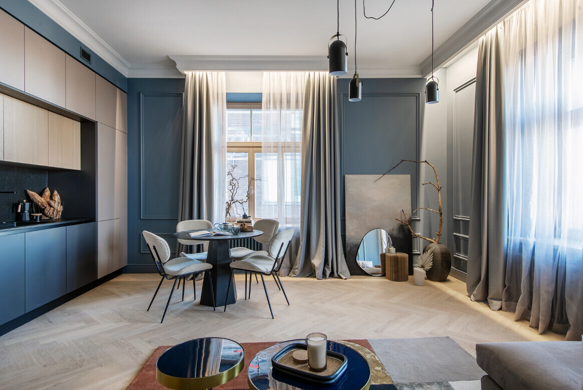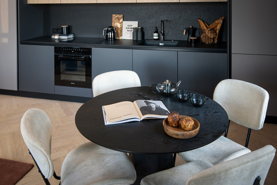 Nama sestajā stāvā izbūvēti 7 plaši penthouse dzīvokļi, un trijos no tiem kā īpašu priekšrocību varēs izbaudīt arī ekskluzīvo skatu uz Vecrīgu. Savukārt demo mājokļu apdarē izmantoti augstas kvalitātes materiāli (itāļu Terazzo flīzes un Hansgrohe un Laufen santehnika, vācu ozola koka parkets, trīs stiklu pakešu koka logi no ARBO Windows, ar augstu skaņas un siltumizolācijas koeficientu), taču tie ieturēti dažādos stilos – viens no tiem veidots pašlaik ļoti pieprasītajā klasiski skandināviskajā stilā, bet otrs savā raksturā ir vairāk piederīgs prestige jeb premium klasei.
