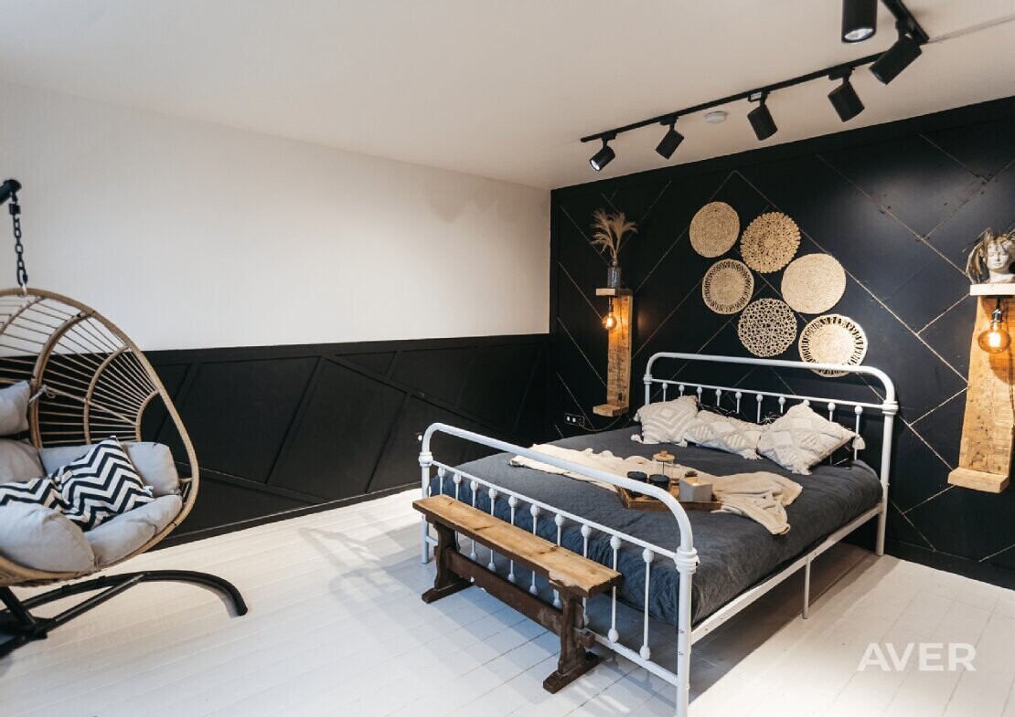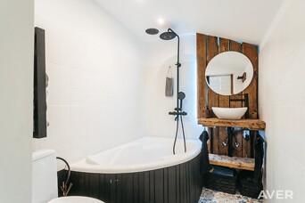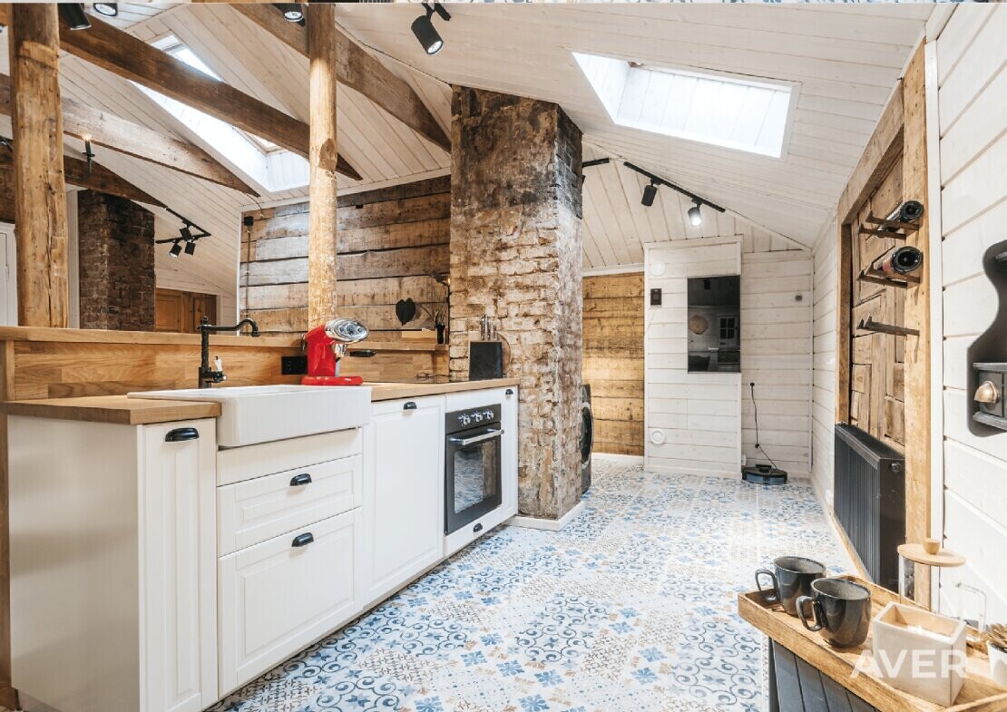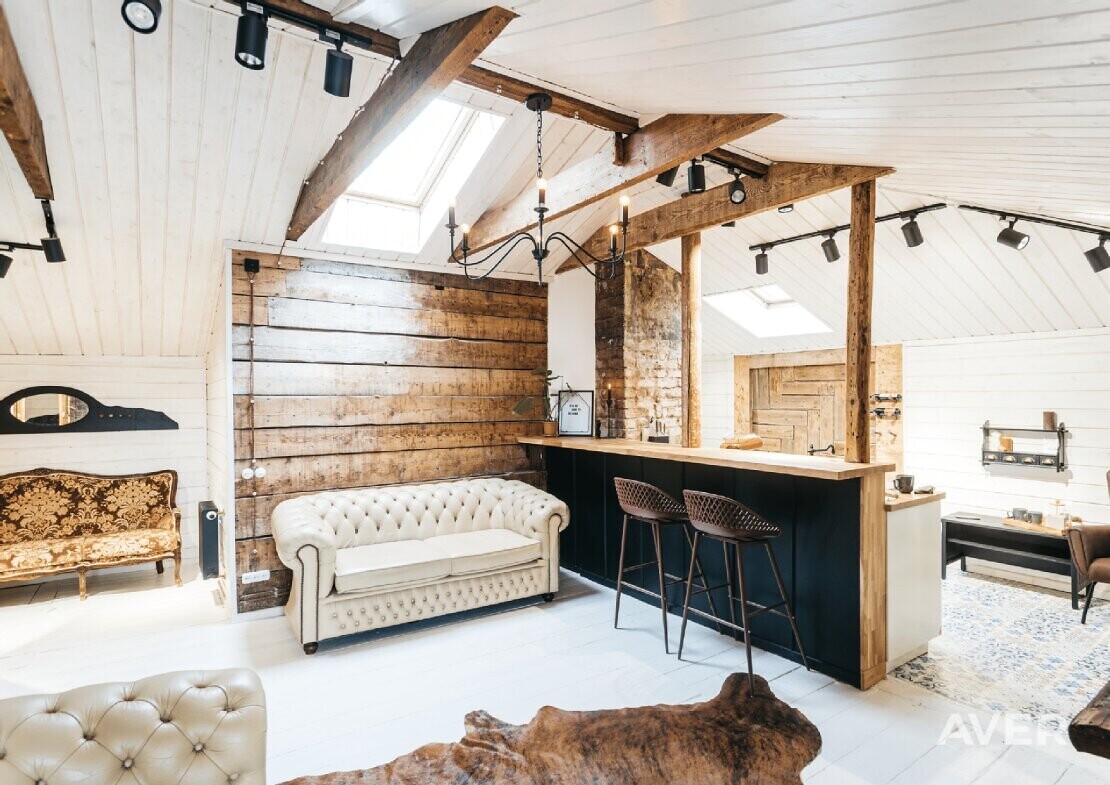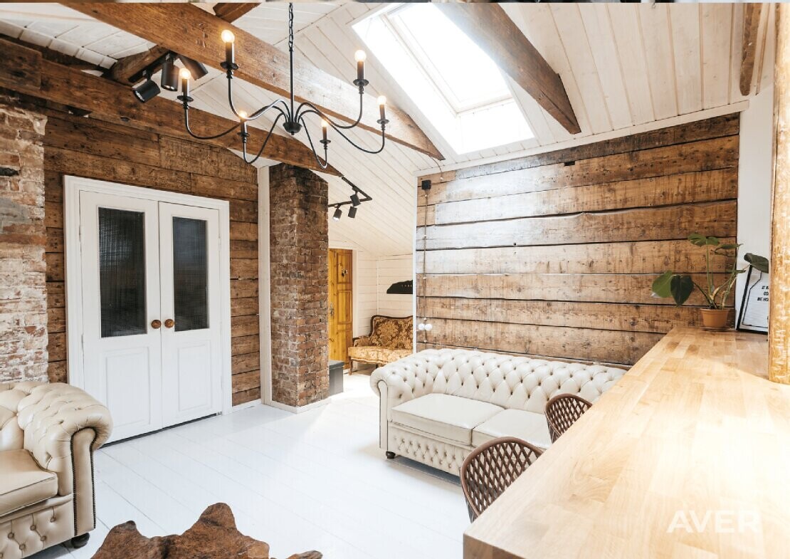 Dzīvoklis ir mansarda tipa, ar augstiem griestiem (augstākajā vietā apmēram 3,5 m, zemākajā - 2,5 m), pilnībā renovēts un gaumīgi iekārtots, kur senās vērtības apvienotas ar mūsdienīgajām, radot īpašas kvalitātes sajūtu un mājīgu atmosfēru (viesistabā ir iebūvēts biokamīns, atjaunotas senas mēbeles, Chesterfield dīvāni, kvalitatīvas žalūzijas, dizaina spoguļi, lustras, šūpuļkrēsls, mansarda apstrādei izmantoti koka apdares dēļi, individuāli veidoti dizaina elementi).