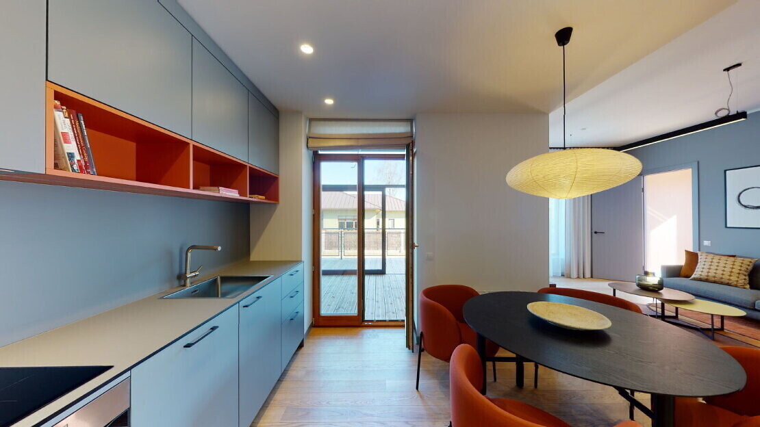 14. dzīvoklis – trīsistabu dzīvoklis tiem, kuri vēlas dzīvot dzīvoklī, bet izbaudīt privātmājas sajūtas. Šī dzīvokļa bonuss ir tā plašā terase 48,1 kvadrātmetra platībā. Dzīvoklī ir viesistaba ar virtuvi, divas atsevišķas guļamistabas un divas vannasistabas. Lai dzīvokļa jaunajiem saimniekiem atvieglotu pārcelšanos uz jauno dzīvesvietu, projekta dizainu izstrādājusi dizainere Anna Ilmere. Šī īpašuma kopējā platība 115,1 kvadrātmetrs. Pārdošanas cena: 175 527 EUR. Plašāka informācija par dzīvokli šeit!