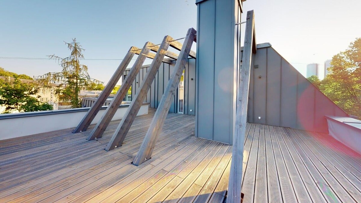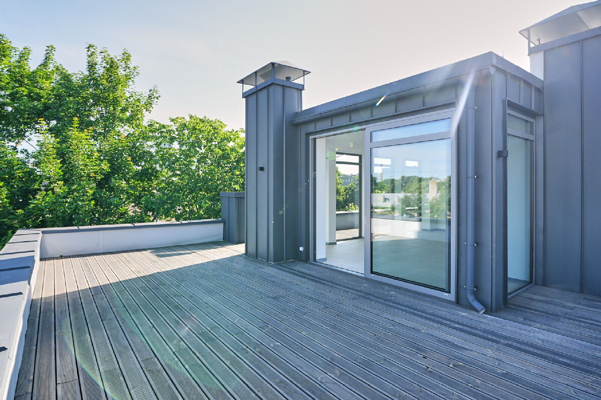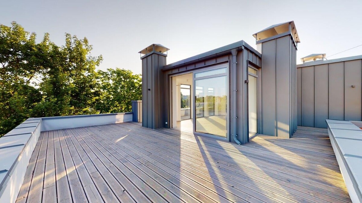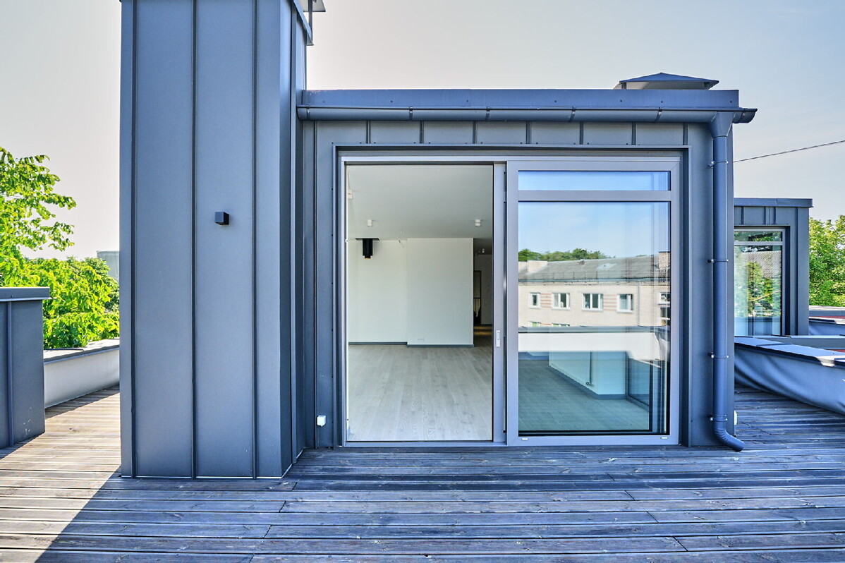 Pateicoties pievienotajai vērtībai, ko mājoklim piešķir plašā jumta terase, mājās būšana vienmēr būs kvalitatīvi pavadīts laiks, lai arī ko saimnieki izvēlētos darīt – svinēt svētkus, atpūsties vai strādāt. Ernestīnes ielas penthouse terases platība sasniedz 145 kvadrātmetrus un, izejot uz tās, domās uzreiz uzaust kino redzētās idilliskās ainas ar ģimenisku kopā sanākšanu vai ballītēm draugu lokā, kādas piedzīvot savās mājās sapņojis ikviens. Terases plašums un iespaidīgās koka sijas ļauj šeit izpausties ar daudzveidīgām mēbelēm, mājīgiem apgaismojuma elementiem, kā arī interjera dizaina risinājumiem, radot to par aizraujošu oāzi, kur pulcēties vistuvākajiem un mīļākajiem cilvēkiem, piedzīvojot neaizmirstamus atpūtas brīžus un svētku svinēšanu.