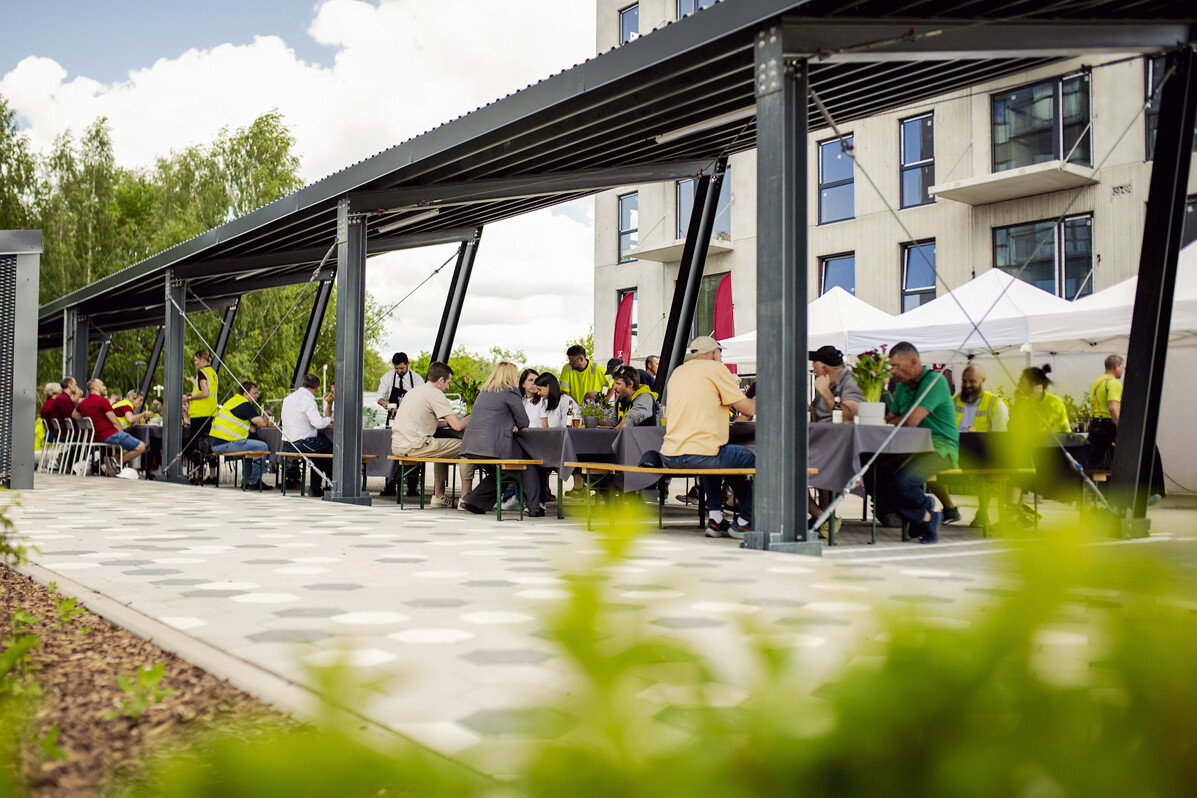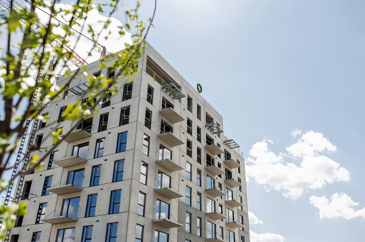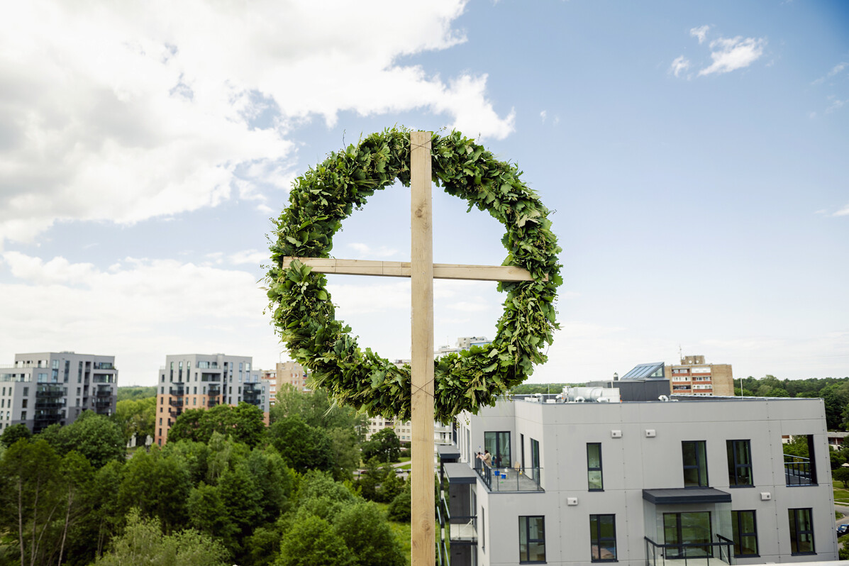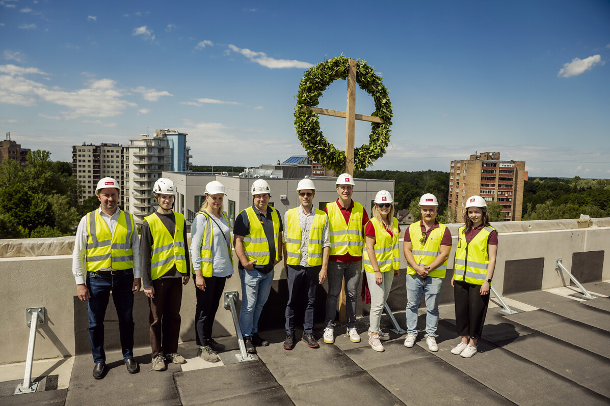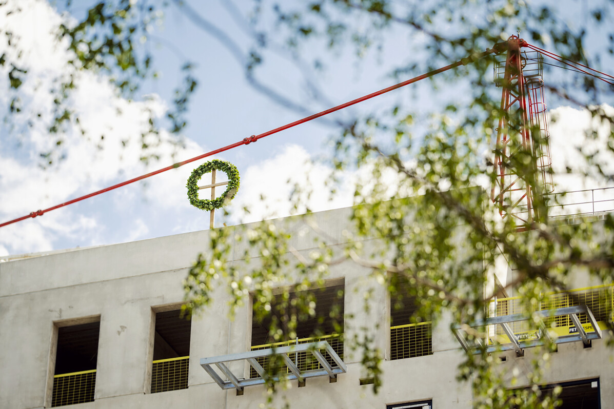 Turpinot nozarē iecienīto Spāru svētku tradīciju un noslēdzot jaunās deviņstāvu ēkas karkasa izbūves darbus, tās augstākajā punktā, aptuveni 30 m augstumā, uzlikts ozolzaru vainags. Tas papildināts ar korinšu zariem un pīlādzi, simbolizējot aizsardzību pret ļaunajiem spēkiem, kā arī smilgām un vārpām, kas izsenis liecina par auglību un labklājību. Šobrīd gandrīz visā ēkā jau ielikti logi, un turpinās ģipškartona sienu, grīdu konstrukciju, kā arī inženiertīklu izbūves darbi. Nožogotajā pagalmā jau apskatāmas zem nojumēm izveidotās autostāvvietas un velosipēdu novietnes, bērnu laukumiņš, āra trenažieri un daļa no krāšņajiem apstādījumiem, kurus ainavu arhitekts izvietojis arī uz reljefa paaugstinājumiem.