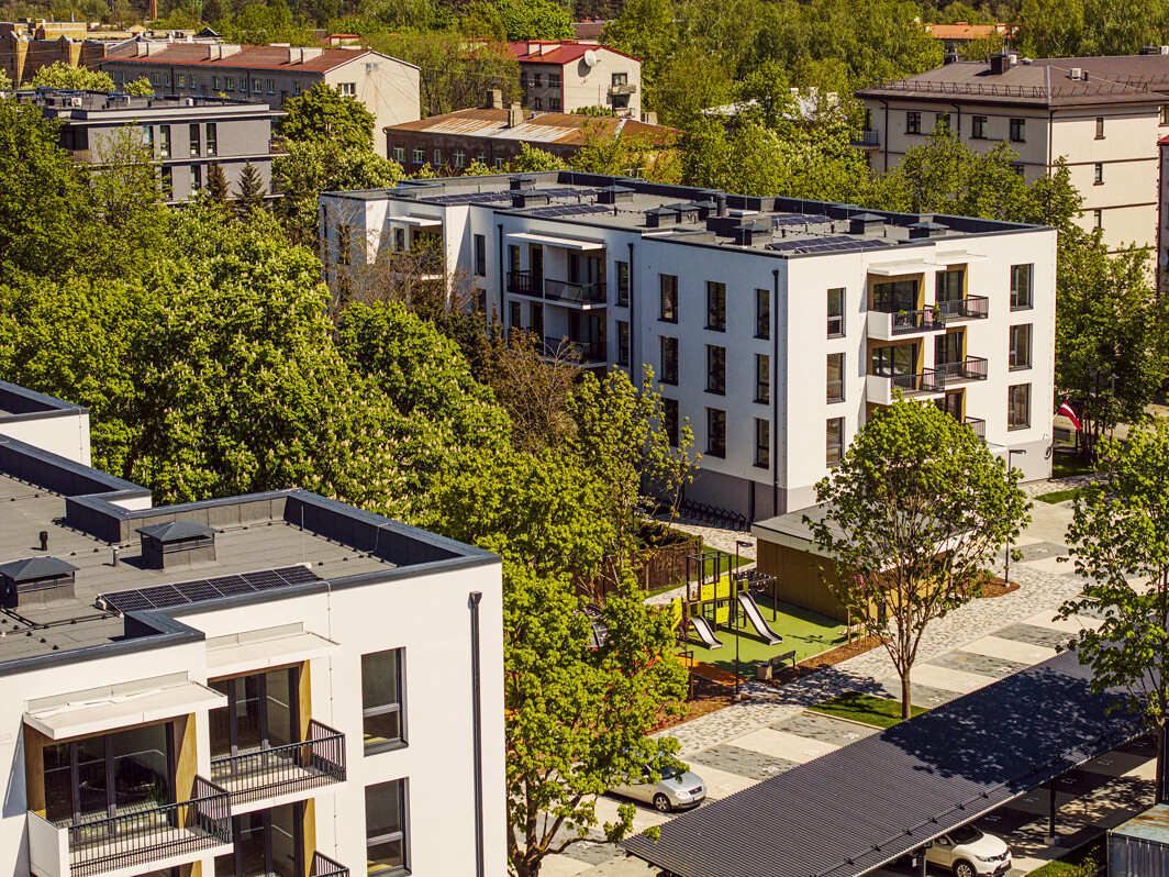 Saules gaisma jauno mājokļu logos iespīd rītos un vakaros, katrā dzīvoklī ir balkons vai terase, individuāli regulējama zemgrīdas apkure un ventilācijas iekārta ar rekuperāciju veselīgam mikroklimatam telpās. Plašuma sajūtu mājokļos sniedz 2,7 m augstie griesti, un uz ēku jumtiem izvietotie saules paneļi nodrošina koplietošanas telpu elektroapgādi. Projekta nožogotajā iekšpagalmā pieejamas noliktavas telpas, pārdomāts bērnu laukums, kā arī atsevišķa ēka velosipēdu novietošanai ar velosipēdu remonta staciju.