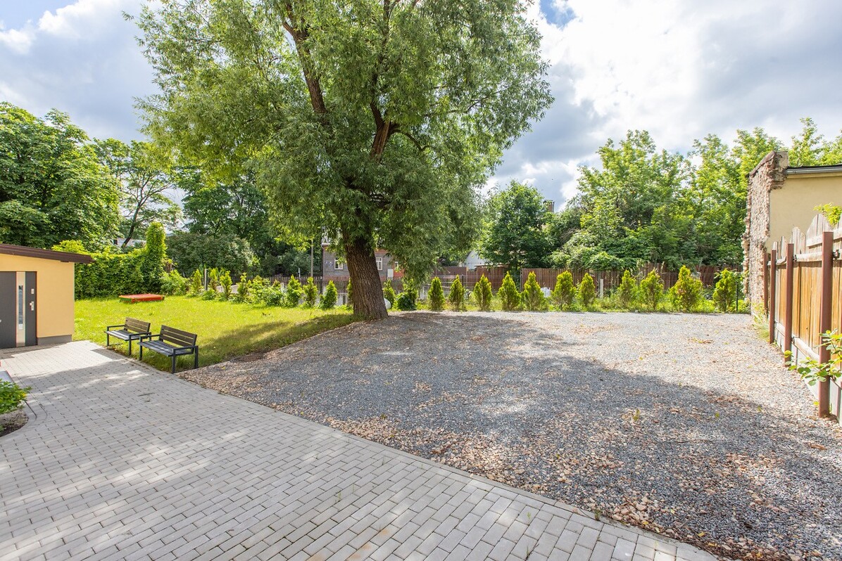 Pirmā stāva dzīvokļiem papildu būs iespēja izmantot piemājas zaļo teritoriju. Katram dzīvoklim tiks piedāvāta vieta noliktavai un paredzētas arī 12 autostāvvietas. Apkārt teritorijai ir uzstādīts koka žogs un automātiski kontrolējama iebrauktuve. Mājas teritorijā ir saglabāti esošie koki un krūmi, uzstādīts arī bruģis.