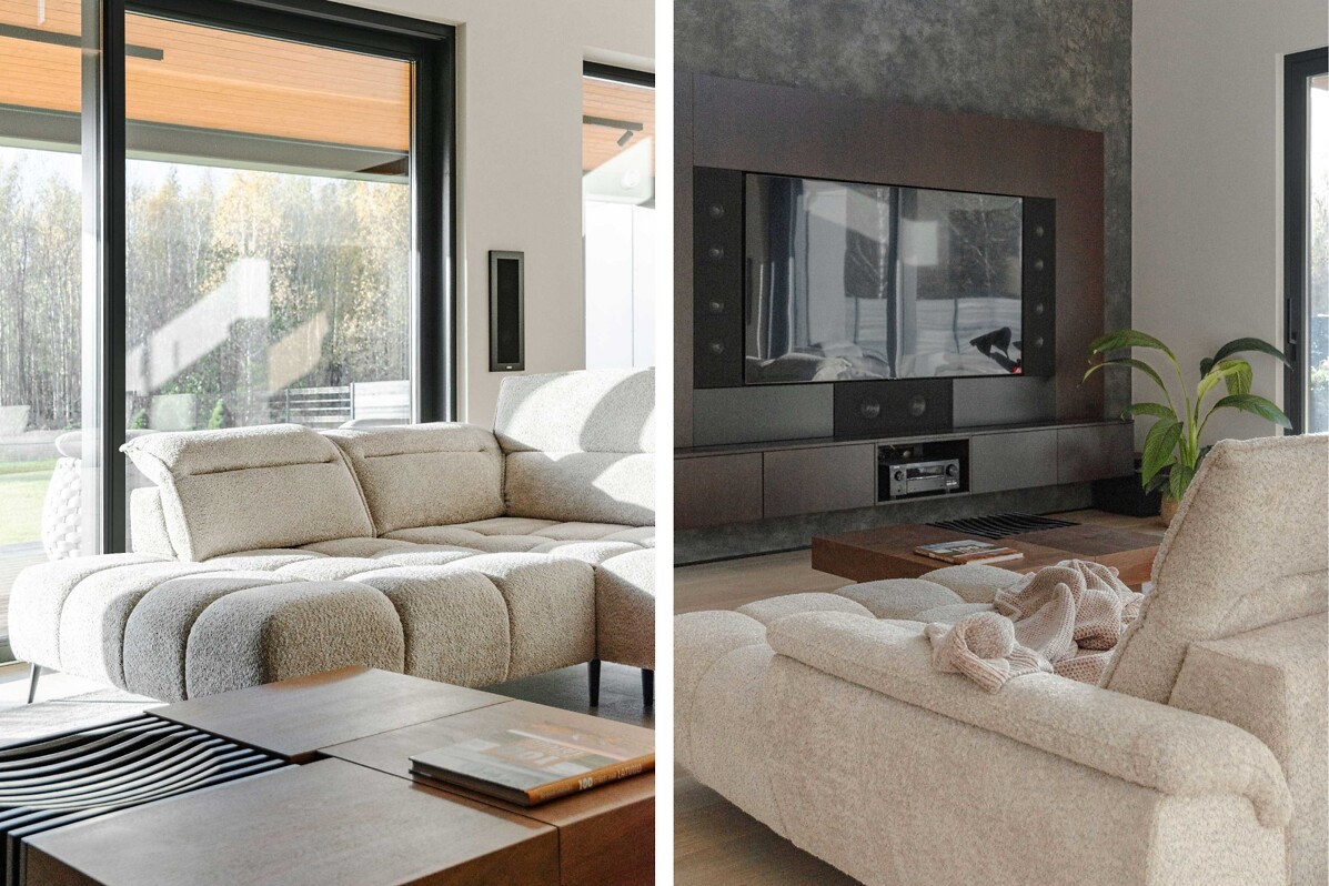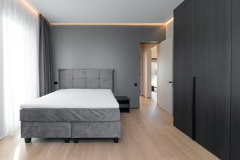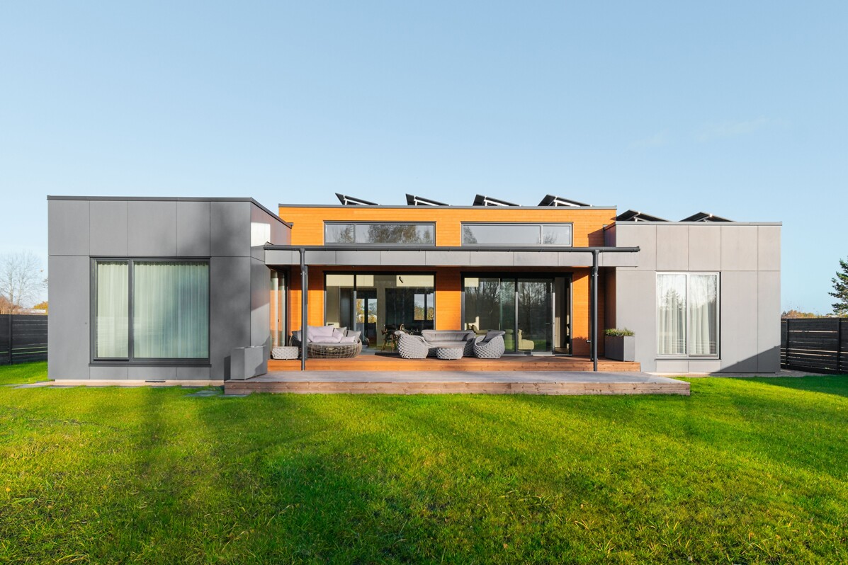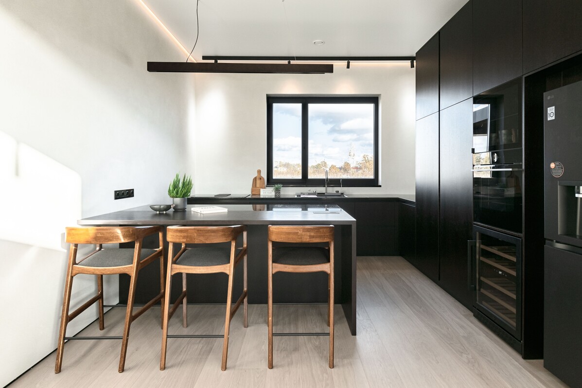 Māju fasādes dizains veidots divos lakoniskos toņos - grafīta tonī, ko papildina mājīgs koks ar nakts fasāžu apgaismojumu, radot mājīgu un vienlaikus izsmalcinātu sajūtu.