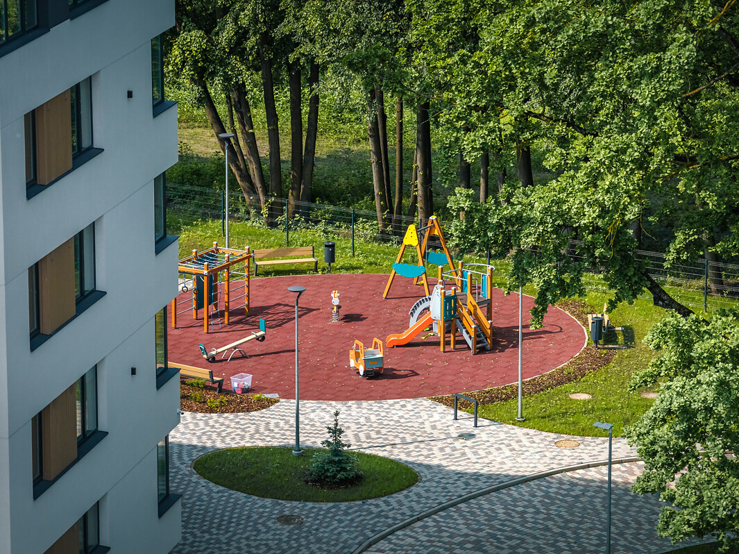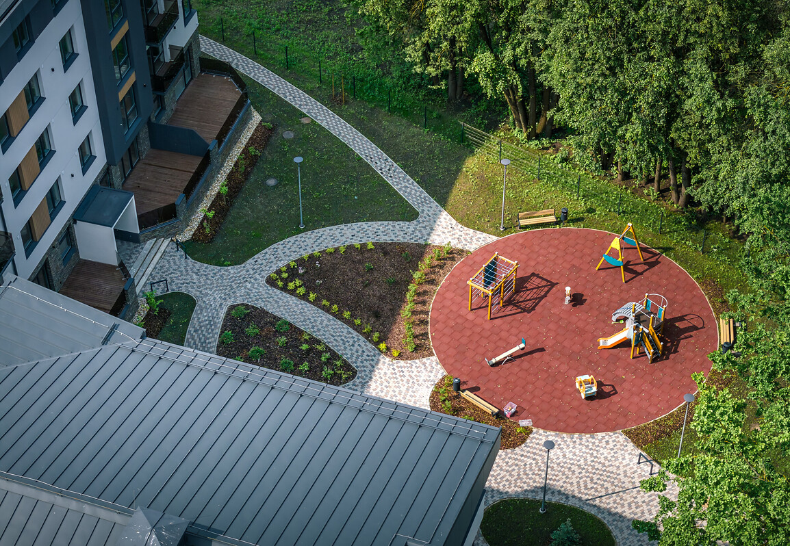 Teritorijā tiek ierīkots rotaļu laukums bērniem, atpūtas soliņi un piknika vietas trīs aizsargājamu ozolu ieskāvumā. Vēl projekts var lepoties ar iepriecinoši daudz autostāvvietām – 33 vietas atrodas pazemē, piedāvājot arī elektroauto uzlādes iespējas, savukārt 25 auto būs iesēja novietot virszemē.