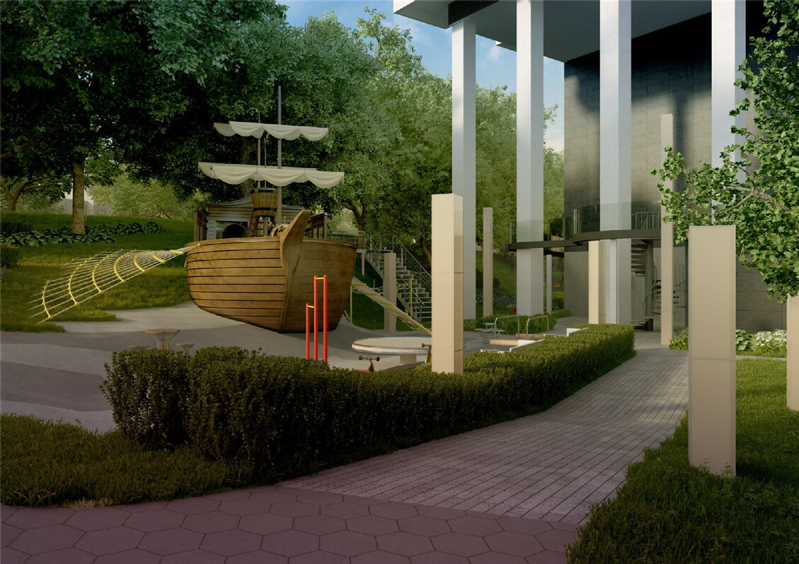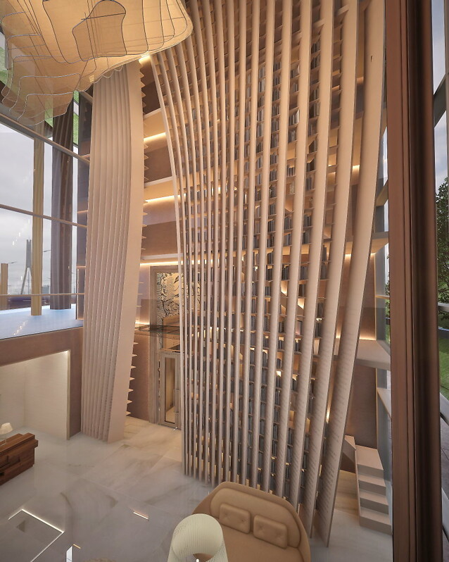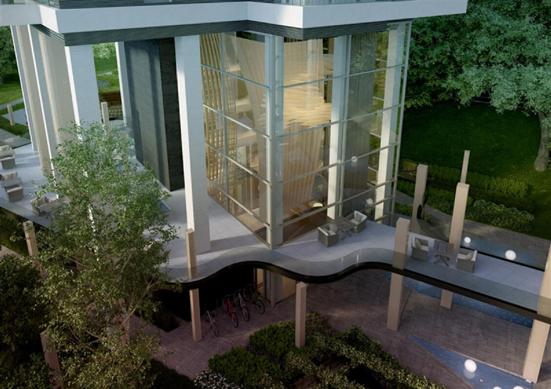 Одной из уникальных архитектурных особенностей проекта является расположение первого жилого этажа – он поднят на 14 метров над землей. На уровне земли находятся только опорные колонны и холл высотой в 12 метров. Архитектор Андрис Кронбергс: «Близость древнего берега Даугавы налагает на архитектуру определенные обязанности. Мы сделали нижние части зданий максимально прозрачными, чтобы не блокировать вид на окрестности и Старый город. Здания уникальны, потому что планировка сделана таким образом, чтобы изо всех квартир был вид на центр Риги и Старый город, чей исторический силуэт находится под защитой ЮНЕСКО».