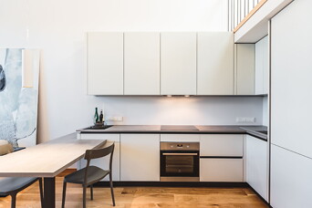 Построенный из газобетона и немного отступающий от фасадной плоскости четвертый этаж здание приобрело в результате реконструкции. Его продуманная планировка и силуэт только улучшили общий облик здания и придали дополнительное пространство, ведь желающих жить в лофте много. Стиль здания оправдывает местоположение, и оно большими буквами должно быть вписано в категорию эксклюзивных проектов. Особое преимущество проекта - высокие потолки, позволяющее реализовать самые смелые и вместе с тем современные, уютные идеи стиля в интерьере.