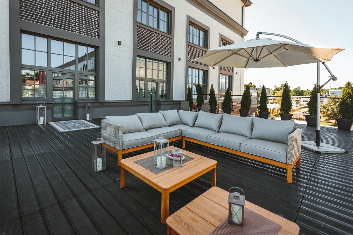 Со стороны двора проект «Promenāde» также скрывает сюрприз – бывшая котельная превратилась в современное офисное здание, став одной из составляющих комплекса. Тщательно созданный эксклюзивный проект «Promenāde» вписывается в новый береговой пейзаж, становясь ценной и утонченной частью индустриального наследия города. В этой части города свой дом нашли многие послы и дипломаты, ценящие покой и тишину, а также детали гармоничной местности и безопасную среду, которую обеспечивают схожие проекты.