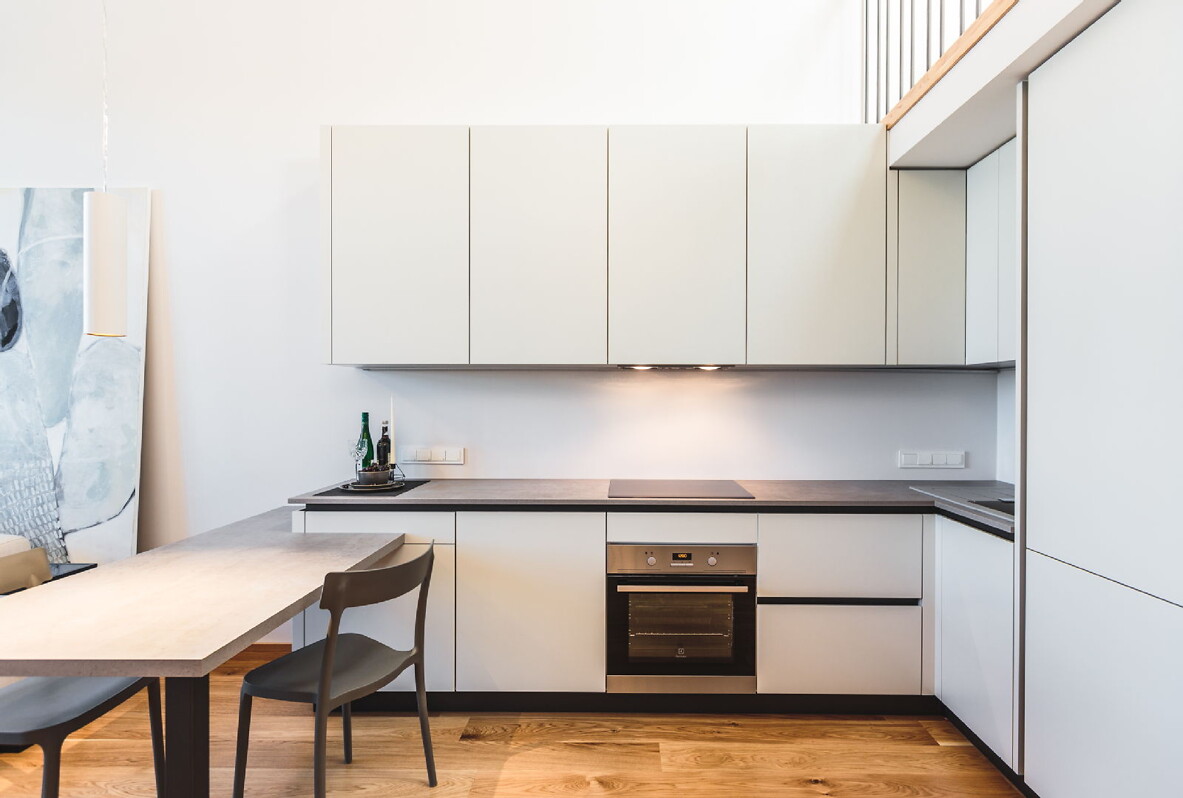 Однокомнатные квартирыПлощадь двухуровневых однокомнатных квартир в проекте «Promenāde» примерно 42 м2. На первом уровне находится жилая комната открытой планировки и столовая / кухня, чтобы отдохнуть после напряженного рабочего дня и приготовить вкусную еду для себя и любимых. Обустроена эргономично спланированная ванная комната, на входе встроен вместительный стенной шкаф. На втором уровне по желанию можно обустроить отдельную спальную зону или использовать пространство для хранения вещей. Квартиры снабжены системами кондиционирования, стиральными машинами, подключением к ТВ, быстрым интернетом и другими современными экстрами – всем, чтобы дом стал тихой гаванью.