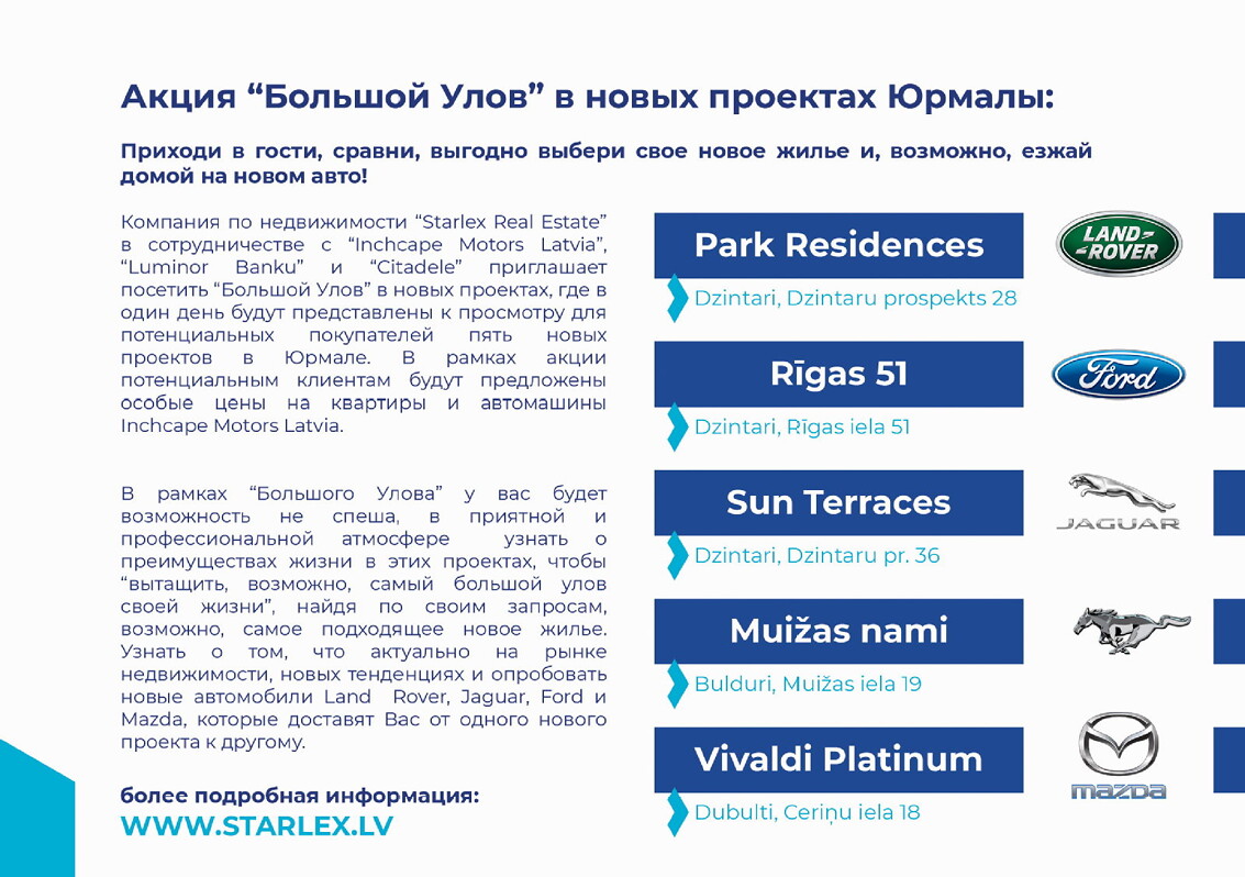 Компания по недвижимости «Starlex Real Estate» в сотрудничестве с «Inchcape Motors Latvia», «Luminor Banku» и «Citadele» приглашает посетить «Большой Улов» в новых проектах, где в один день будут представлены к просмотру потенциальных покупателей пять новых проектов в Юрмале. В рамках акции потенциальным клиентам будут предложены особые цены на квартиры и автомашины «Inchcape Motors Latvia».