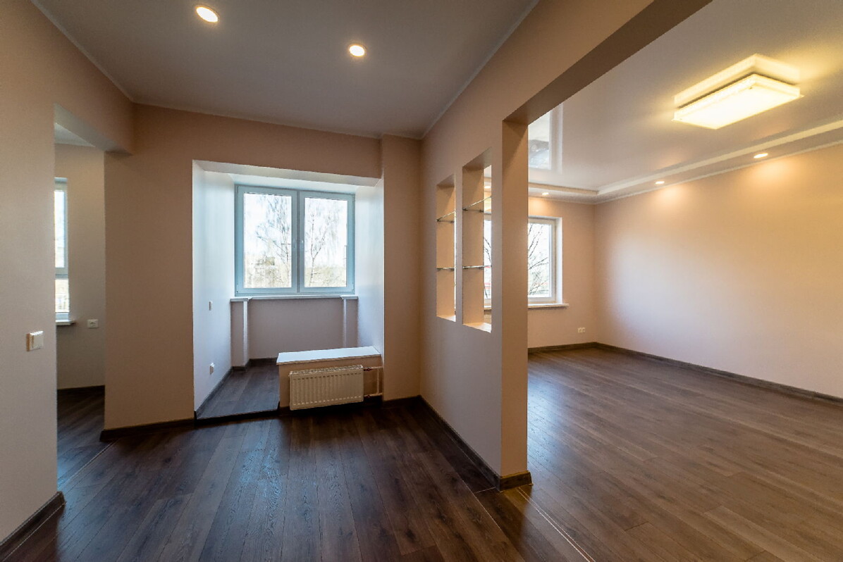 Все стены квартиры, за исключением санузлов, были окрашены. Перед покраской поверхность стен была подготовлена, зашпаклевана и ошкурена. Для выравнивания части стен была использована гипсовая штукатурка Knauf MP75, в частности, это коснулось углов и мест установки плинтуса. Для окрашивания стен профессионалы «Baltic Būves Centrs» использовали краску Sadolin Bindo 7.