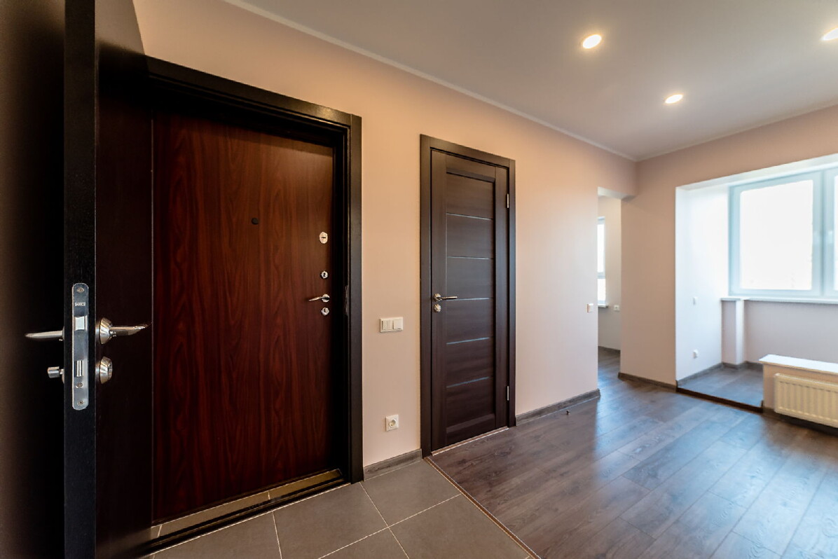 После укладки напольного покрытия в помещениях квартиры, мастера “Baltic Būves Centrs“ установили межкомнатные двери марки Merini 800 venge, приобретенные в компании Prodex SIA. Дверные конструкции были куплены в разобранном виде, и специалисты компании собрали их непосредственно на месте установки. В этом случае появляется возможность скорректировать дверную коробку и наличники, если это потребуется при монтаже двери. К части дверей были установлены отбойники. На вторую входную дверь установили дополнительный порог, чтобы улучшить звуко- и теплоизоляцию.