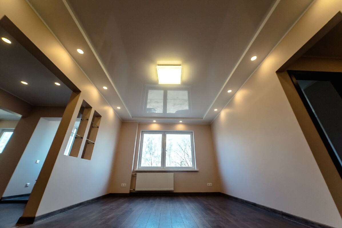 Для декоративного оформления потолков в зале, спальне и детской комнате по периметру помещений были установлены гипсокартонные короба со встроенными LED-панелями. Так как в детской комнате значительного перепада панелей перекрытия не наблюдалось, обошлось без выравнивания потолков гипсокартоном: потолки были оштукатурены и подготовлены под покраску. По желанию клиента в зале и спальне был установлен белый глянцевый натяжной потолок, который зрительно увеличил пространство и сделал помещение нарядным. В качестве центрального главного освещения была установлена лампа LEDLIGHT 60W 3000K 4500lm.