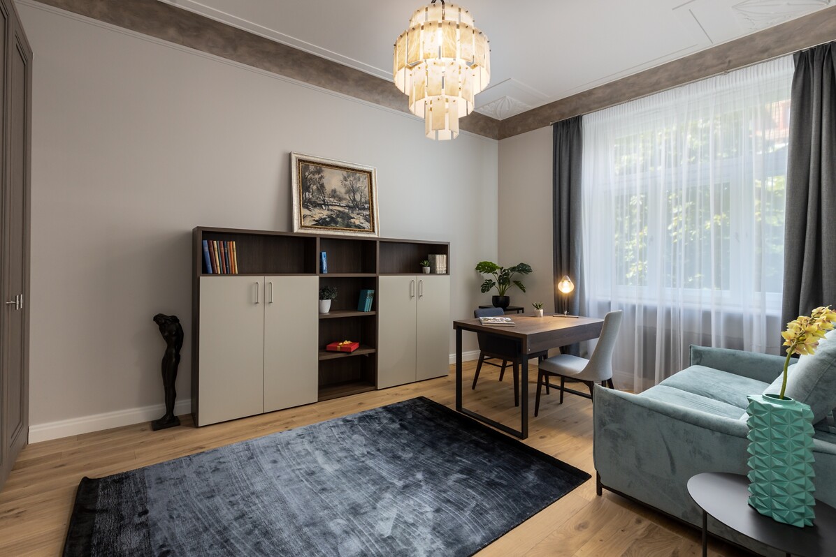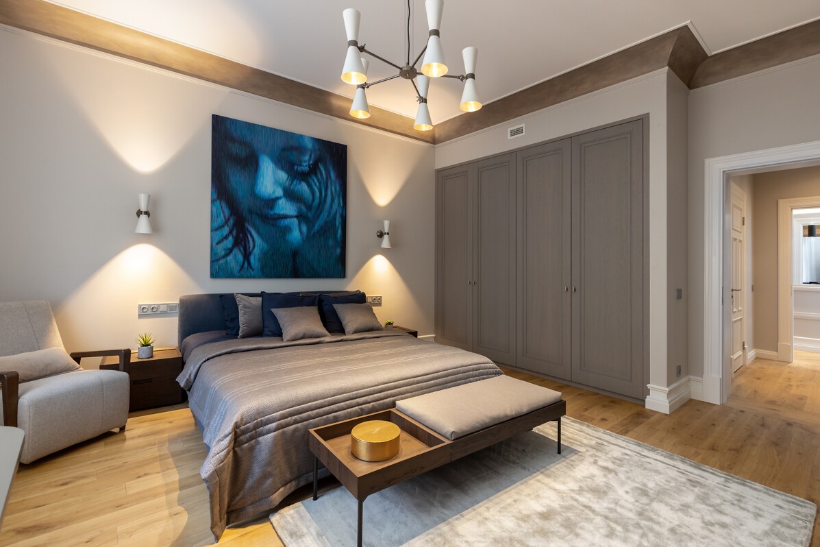 Напольное покрытие - высококачественный дубовый паркет Amber Wood, на стенах дизайнерские обои и высококлассная декоративная покраска. В санузлах установлена сантехника и оборудование производителей класса люкс Vispool, Globo, Nicolazzi, Hansgrohe. В каждой из квартир на Аусекля 14 продуманная планировка, в которой предусмотрено место для встраиваемых шкафов, гардеробов, хозяйственных помещений. Во всех квартирах есть балкон или французский балкон, который вместе с высокими потолками и роскошными декорами югендстиля создают элегантное и элитное настроение в квартирах.