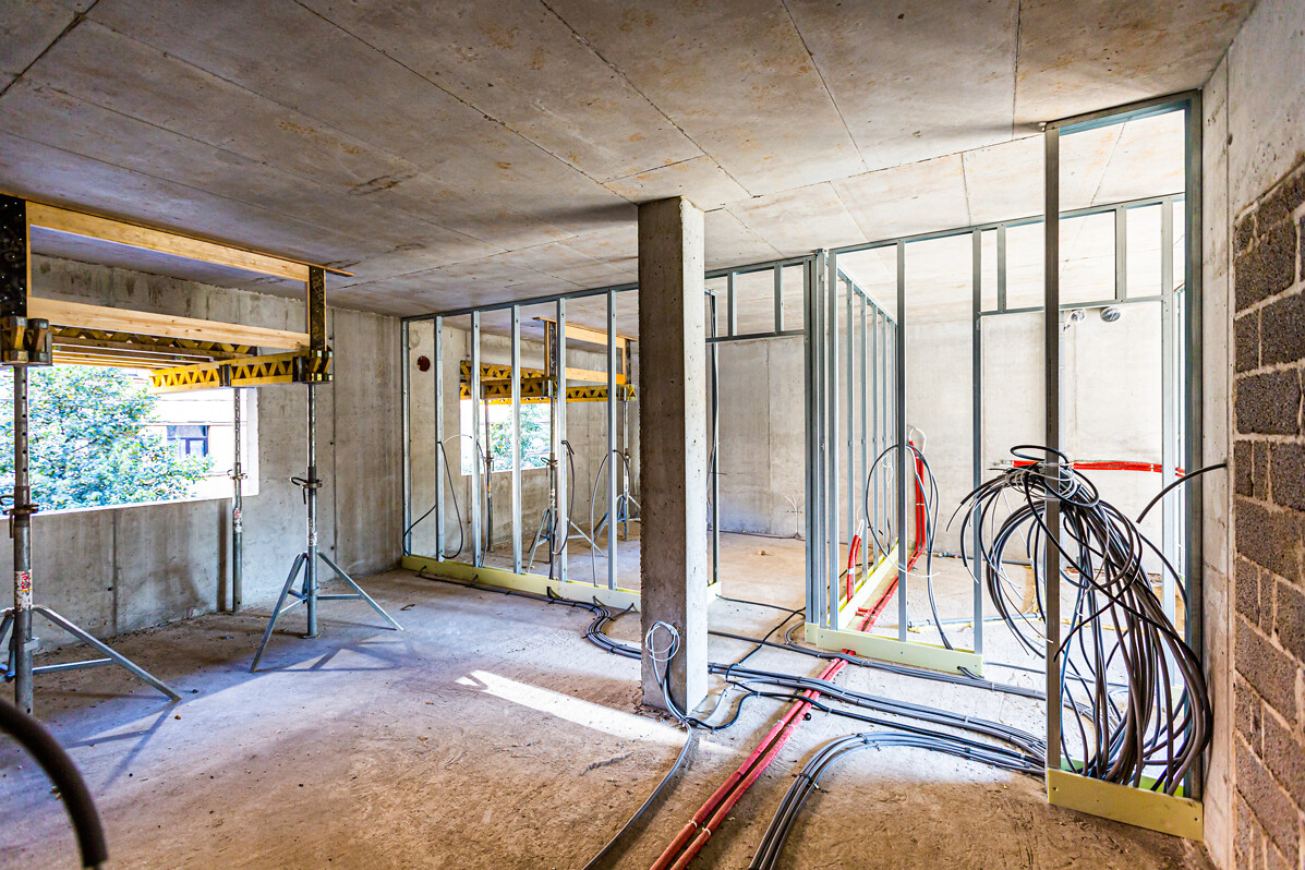 РаботыповозведениюмногоквартирногодоманаСтабу100 идутполнымходом. Дляускоренияпроцесса, недожидаясьзавершениявозведениякаркаса, началисьвнутренниеработы - прокладкакоммуникаций, втомчислеводы, канализации, отопления, электричесчтва, кабелейинтернета. Строителитакжеприступиликустановкеокон, теплоузлаимонтажуосновывнутреннихперегородокпомещений. Этоозначает, чтоужесейчасможноувидетьпланировкибудущихквартир.
