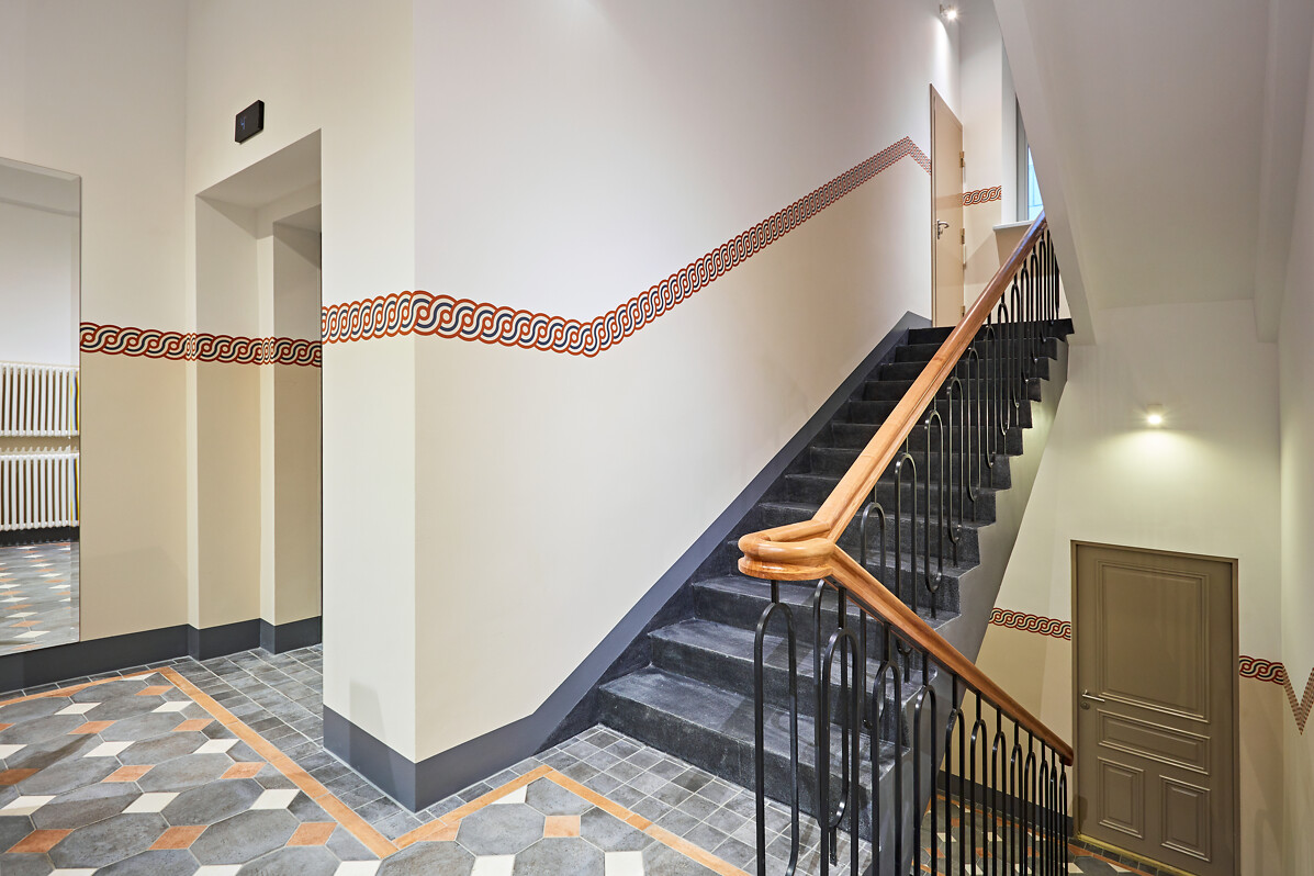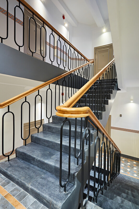 декоративные перила и лестничное покрытие,создано художественное освещение здания.В квартирах установлены новые входные деревянные двери,