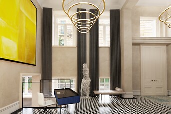 Сотрудничество с Зане Тетере-Шульце продолжается в работе над интерьерами внутренних пространств. В проекте HOFT удалось реализовать особую философию, присущую всем проектам компании R.EVOLUTION. Холлы гостиной, лестничные и квартирные холлы являются логическим продолжением архитектуры в соединении с общей концепцией проекта.