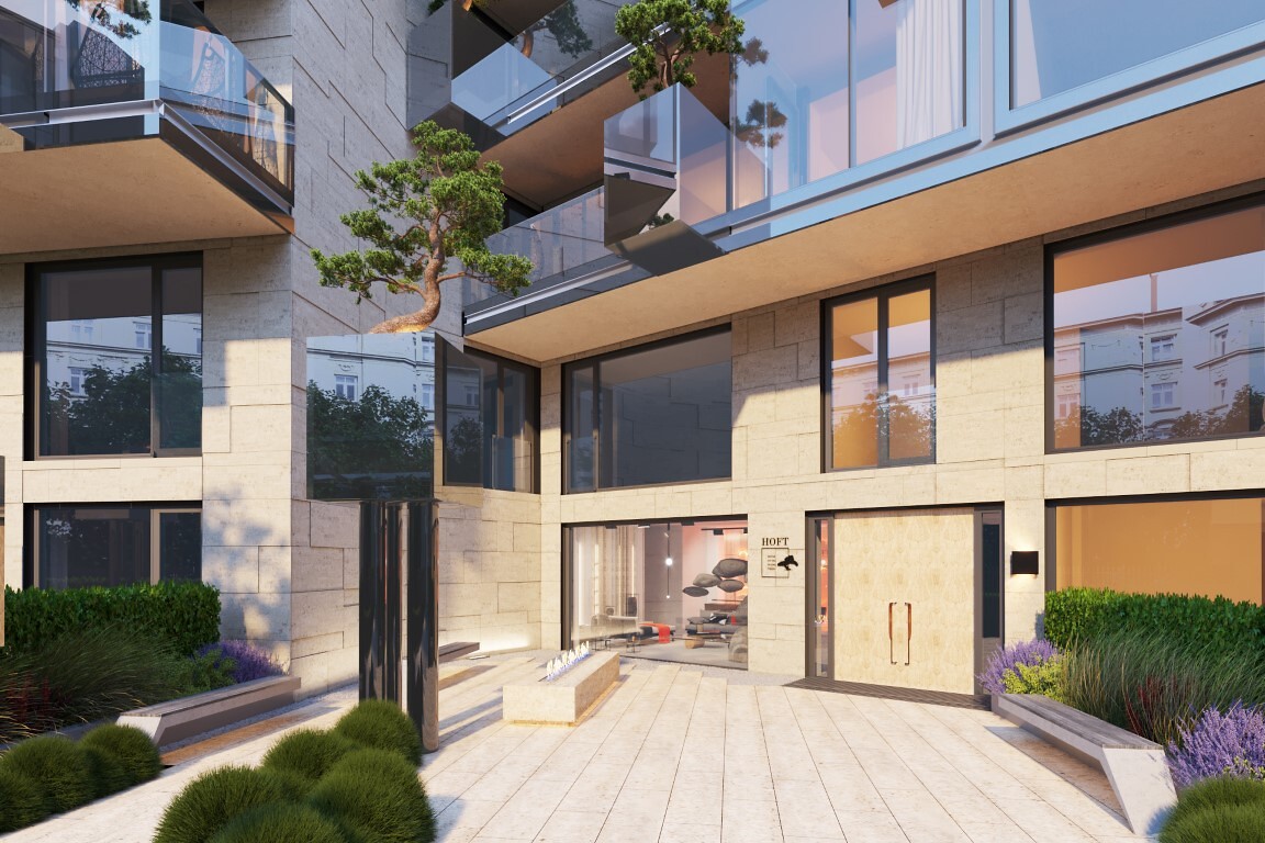 В Hoft благоустройство не дополняет архитектуру, а вдохновляет ее,переплетается с ее формами, создает новые объемы, становится единым целым с фасадами, здесь соединяются историческая архитектура, природа, технологии и искусство. Уникальная концепция “Парящих деревьев“ предполагает установку деревьев “бонсай“ хвойных пород - кедра, горной сосны - на фасаде, террасах и дополнительныхконструкциях с использованием специальной системы креплений. Деревья как дизайнерские объекты, создателем которых выступает сама природа, располагаются словно в стеклянной витрине над бережно сохраненным и восстановленным историческим фасадом. Во дворе исторического здания выстроено новое здание - созданный человеком оазис, склоны горсо струящимся по фасаду водопадом и деревьями на каменистых уступах, современная концепция среды для горожанина, который стремится к единению с природой.