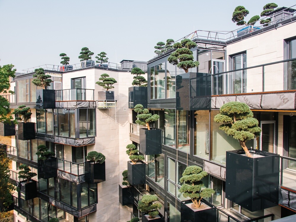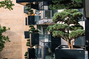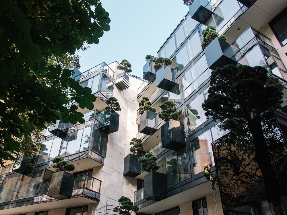 На центральном фасаде, во дворе дома, на террасах, и дополнительных конструкциях, используя специальную систему креплений на разных уровнях, устанавливаются деревья хвойных пород: кедр, горная сосна, разные виды деревьев “бонсай“, создав тем самым частный парк для жителей дома - зеленый оазис в самом центре города. Это размышление на тему “как мы можем не только сохранить природу в городе, но преувеличить ее, используя современные технологии“. Инсталляция производит невероятно сильное впечатление, деревья будто растут в естественной среде, на вершинах и склонах гор.