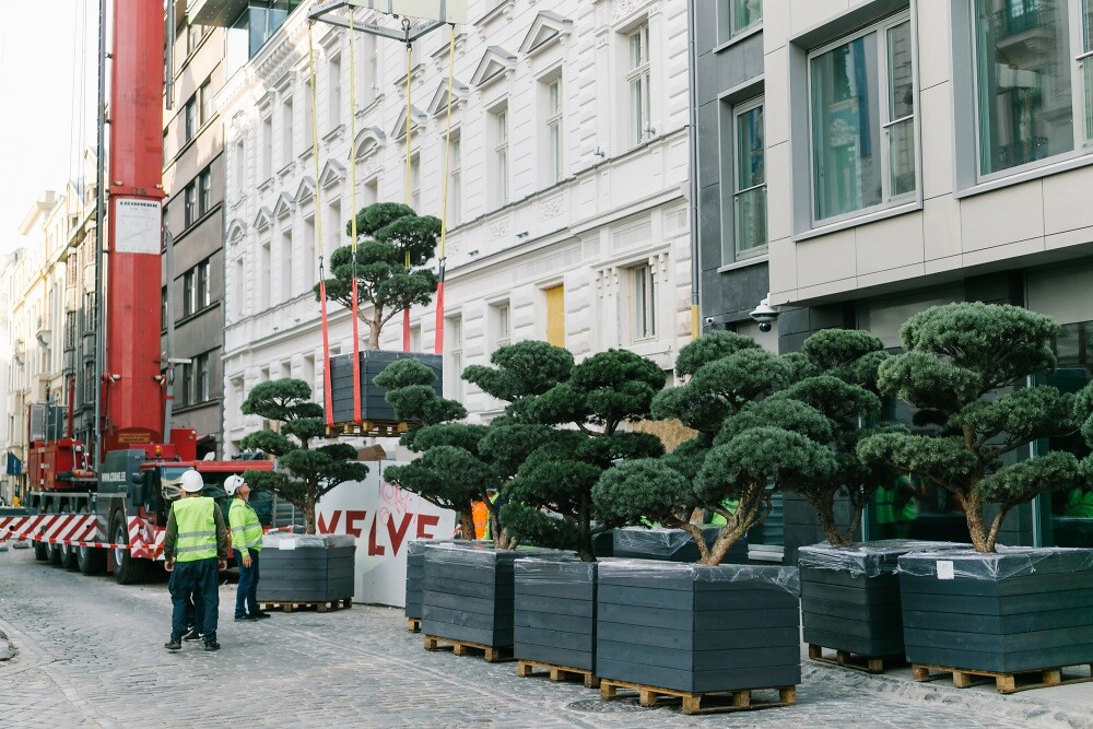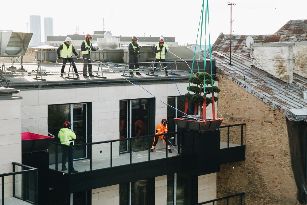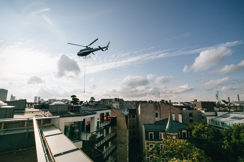 8 октября 2020 года происходил исключительный для Латвии и для мировой практики процесс: установка вертолетом AS 350 деревьев на фасады зданий проекта HOFT. Парящие деревья в Тихом центре - Новости недвижимости - City24.lv портал недвижимостиВ прошлые выходные жители Тихого Центра и гости столицы могли наблюдать необыкновенное зрелище: над домами по улице Стрелниеку парили деревья. И это не очередной перфоменс представителя современного искусства, это реализация уникальной зеленой концепции компании R.EVOLUTION  для жилого многоквартирного проекта HOFT (House of flying trees). При помощи строительных кранов на специальных конструкциях и фасадах зданий проекта HOFT были установлено 36 деревьев.