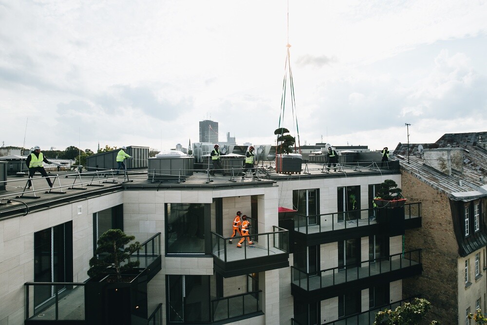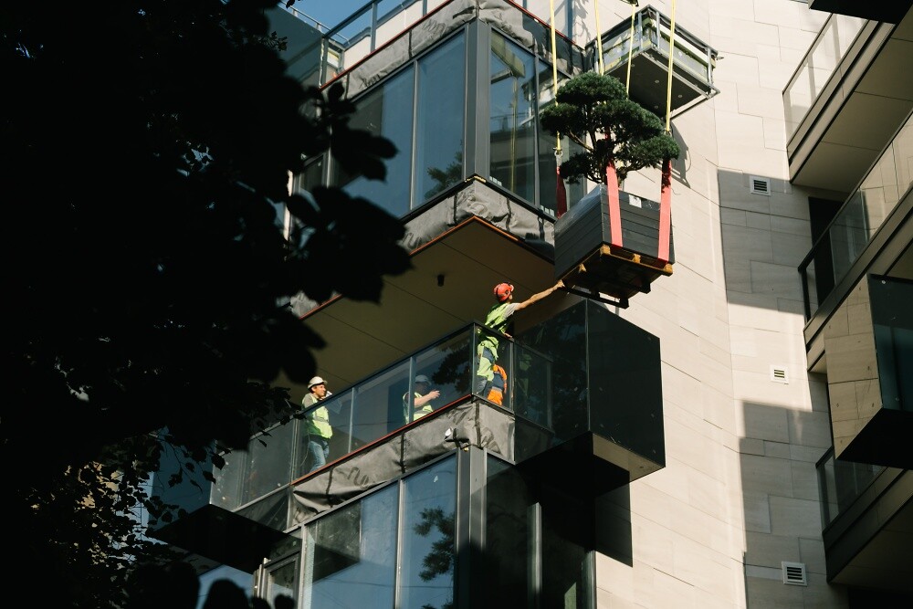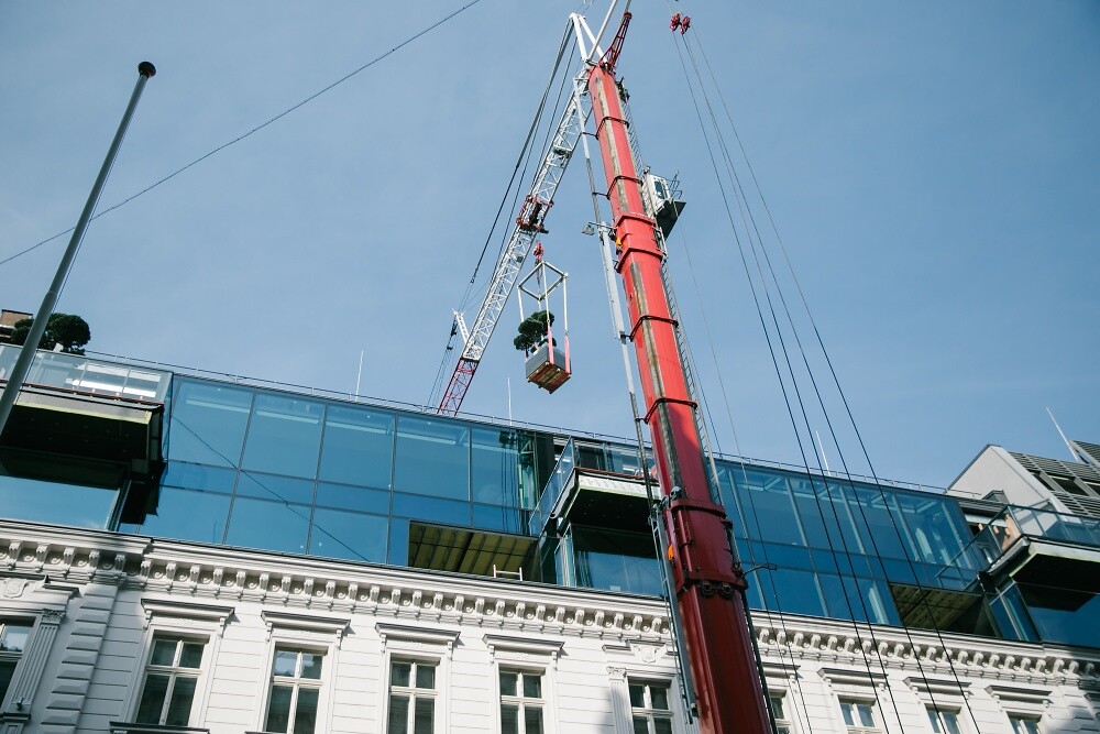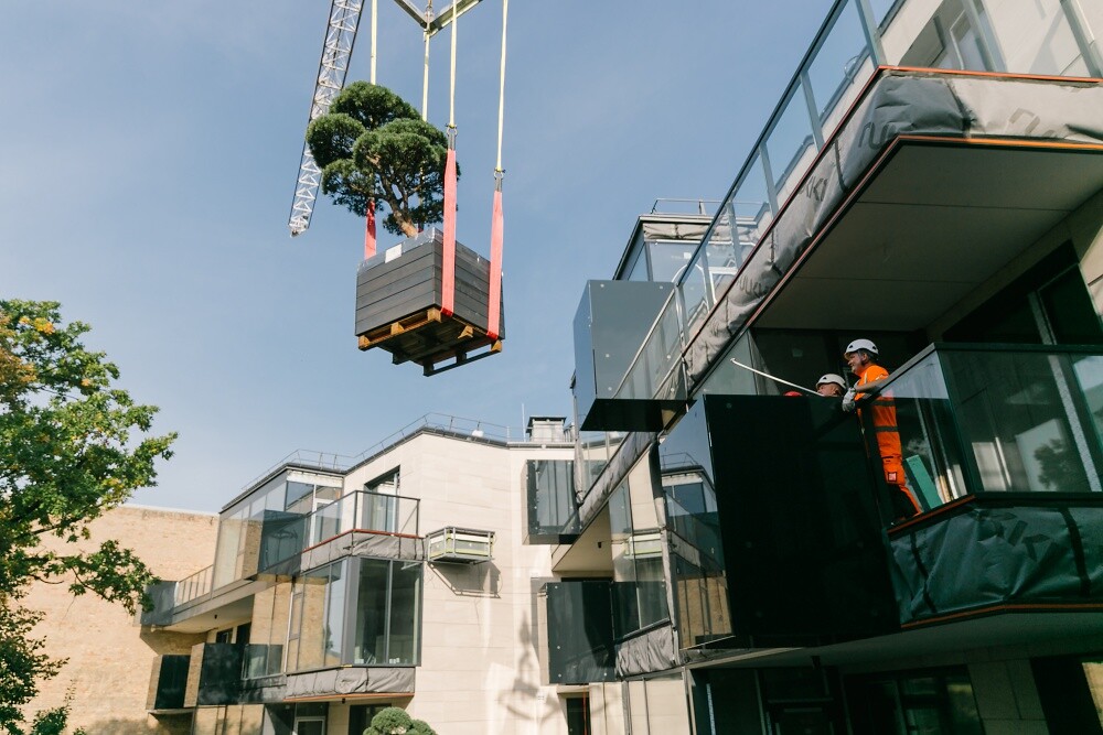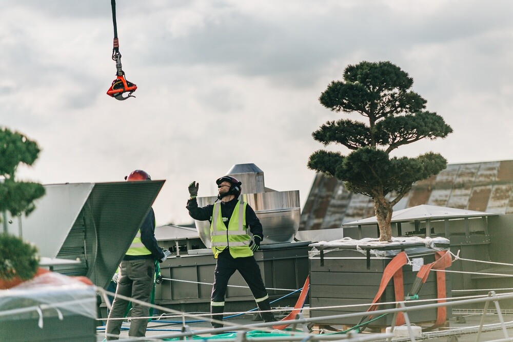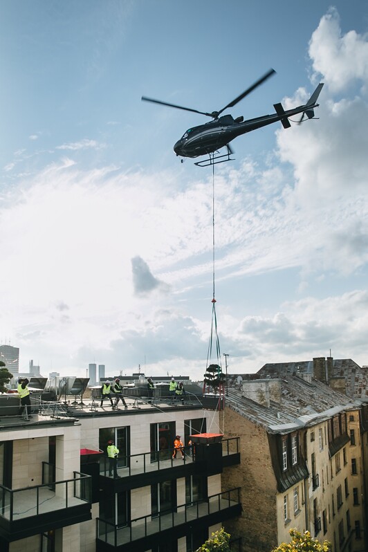 Сложнейшую задачу, выполнение которой начали профессионалы HEAVY CRANES с помощью кранов, завершили вертолетом специалисты высокого класса GM Helicopters: два дерева были перенесены на платформы фасадов верхних этажей современной части проекта.