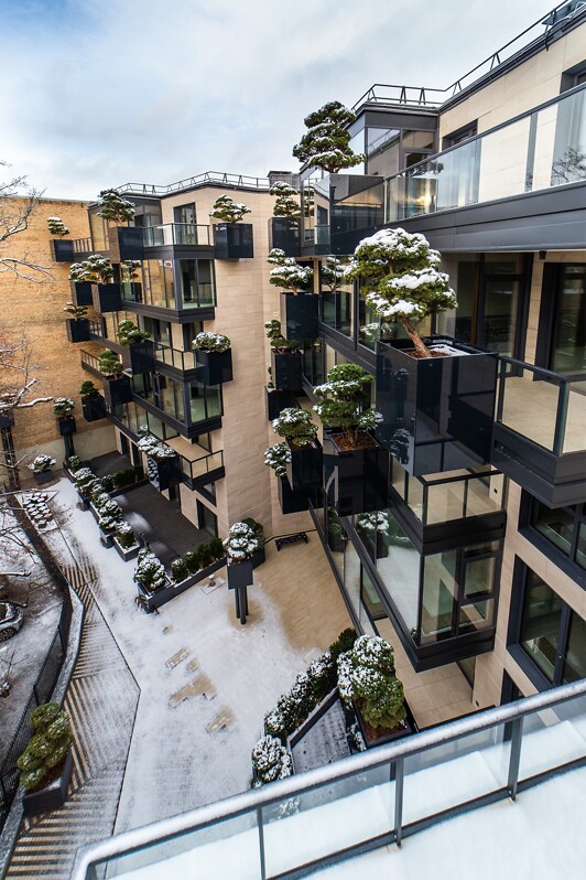 в воздухе деревья на фасаде, террасах и во во внутреннем дворе