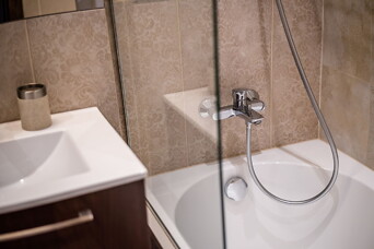 Хозяин квартиры — высокий мужчина с ростом 1.90 м, поэтому была выбрана большая и комфортная ванна из каменной массы Oberon Solo 170 см на 75 см, что и повлекло за собой основную причину увеличения самой ванной комнаты. Для эстетичного вида была установлена стеклянная перегородка, которая будет защищать стены и пол от воды. Такое решение намного симпатичнее и, в перспективе, экономичнее чем пластиковые шторки, поэтому мы его устанавливаем уже не первый раз.