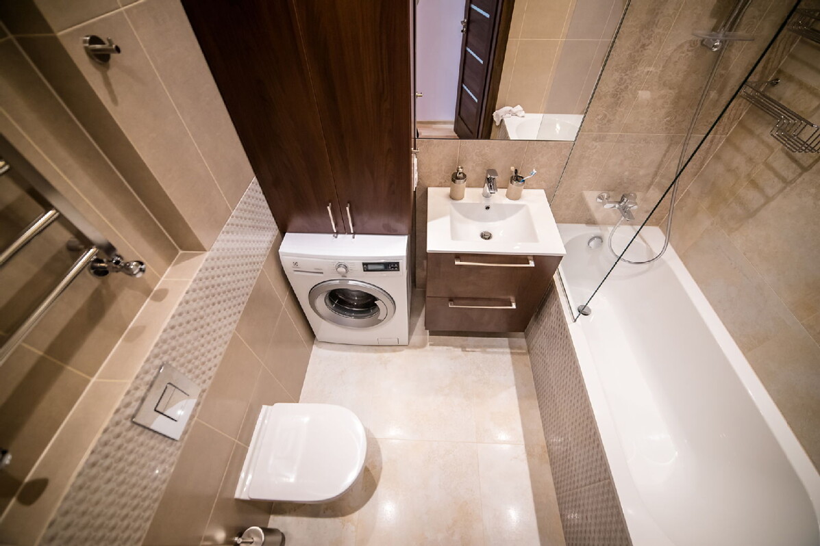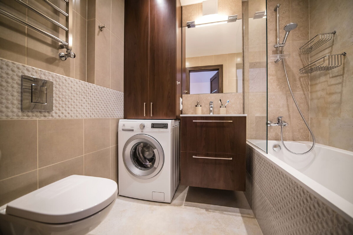 Из ламинированных, влагостойких материалов, были изготовлены шкафчик над стиральной машиной и под раковиной.