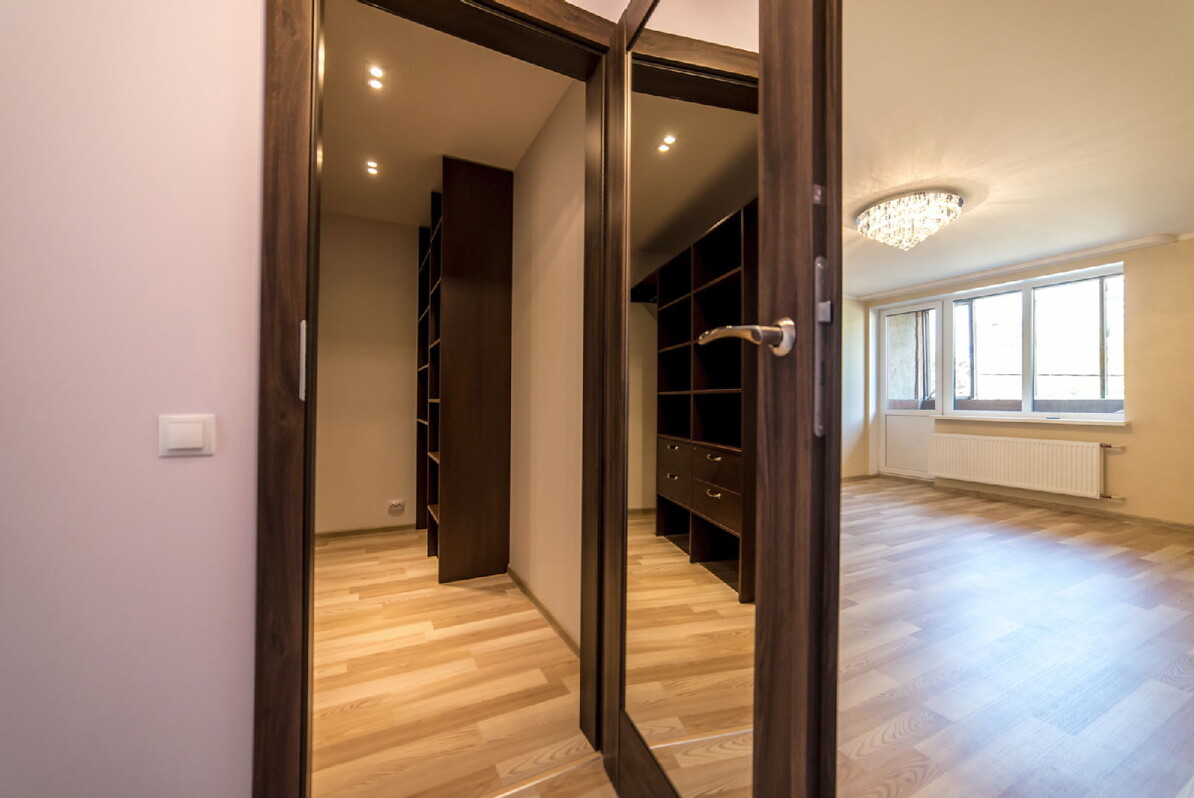 С внутренней стороны гардеробной, на дверь, было установлено зеркало во весь рост. Мы не стали его крепить к стене, поскольку полки гардеробной со временем могут расширится по периметру свободных стен. Таким образом зеркало не будет служить препятствием.