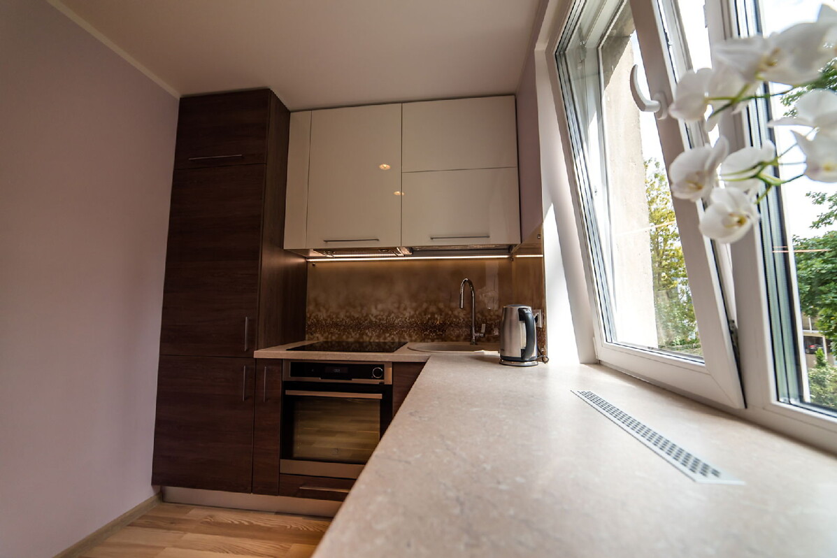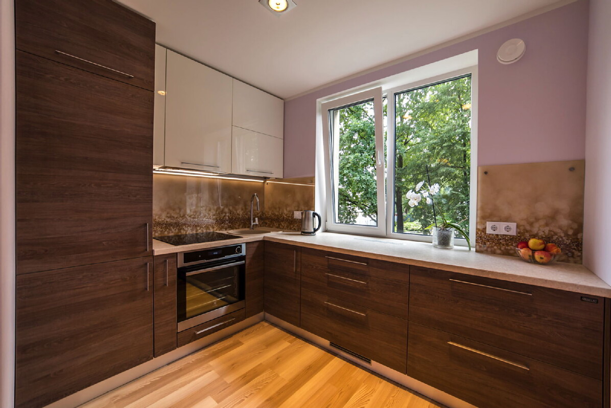 Современный ламинат довольно неприхотлив и легок в уходе, поэтому хозяева решили постелить его и накухне. Стены и потолки отшпатлеваны и покрашены водоэмульсионной краской для облегчения уборки.