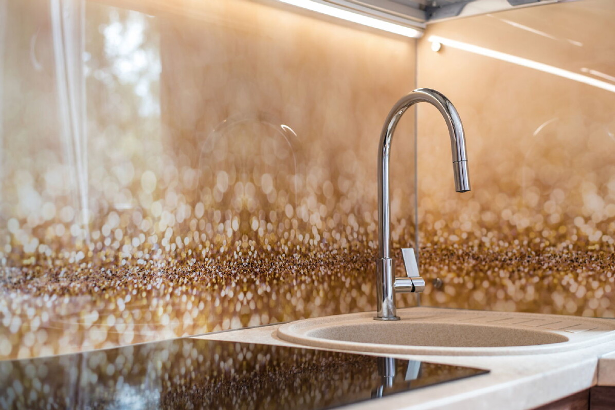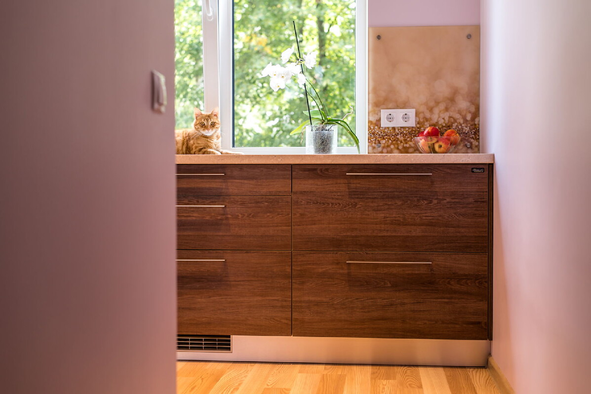 На кухне была установлена встроенная мебель и техника. Верхние фасады шкафчиков — глянцевый полированный мдф, нижние — ламинированные, марки Egger. Каркас выполнен из ламинированной плиты, столешница — также Egger. Над рабочей поверхностью был установлен стеклянный фартук, сделанный по технологии Clear Vision, оклеенный рисунком, который подобрали хозяева.