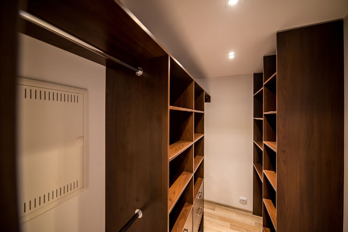 Для удобного доступа к одежде, был выбран открытый тип полок. Конструкция такого шкафа обходится намного дешевле, т.к. к расходам не прибавляется стоимость механизмов выдвижных ящичков. К тому же в них нет необходимости, если шкаф находится не на виду, а в гардеробной.