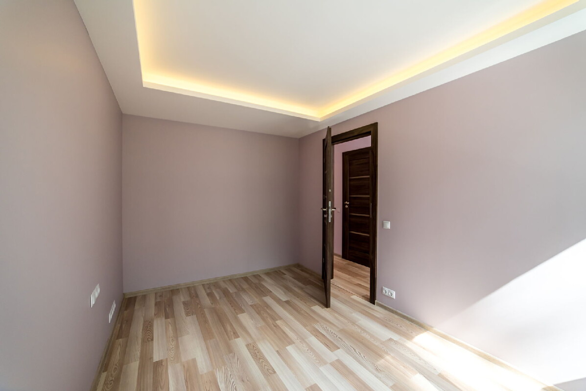 Для мягкой и экономичной светодиодной подсветки, в спальне мы сконструировали короб, а также сделали нишу для штор. Кстати, если вешать шторы от потолка до пола, окна будут казаться визуально больше.