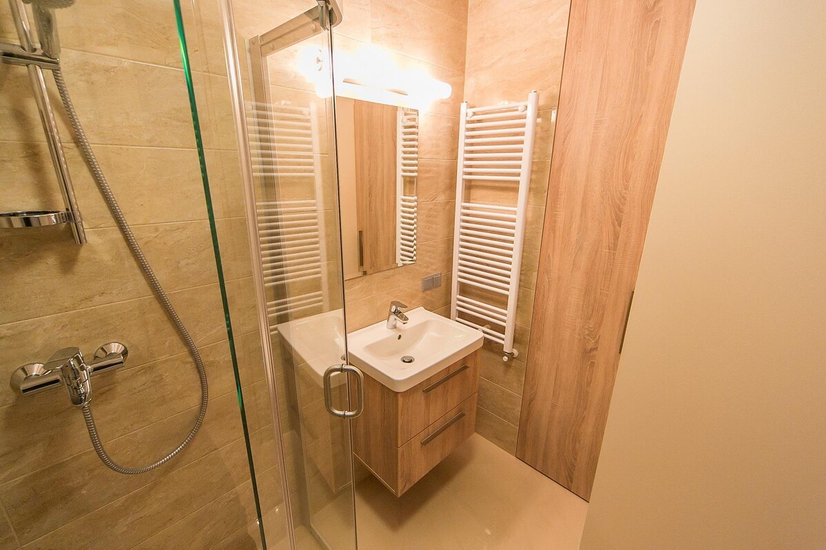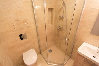 Из-за удобного подключения к канализационному стояку, было решено поставить душевую кабину без поддона, с вмонтированным в пол трапом, а также нишей для душевых принадлежностей. Такое решение существенно экономит место и смотрится более воздушно! Для того, чтобы в кабинке не было луж и сырости, мы сделали небольшой уклон пола вокруг трапа.