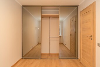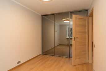Мы постелили добротный ламинат, отшпатлевали потолки и стены, а также покрасили их водоэмульсионной краской. Для экономии пространства, был установлен вместительный шкаф купе. Большое зеркало не только несет свою основную функцию, но и визуально увеличивает небольшое пространство спальни. Это станет особенно заметно, когда появится мебель.