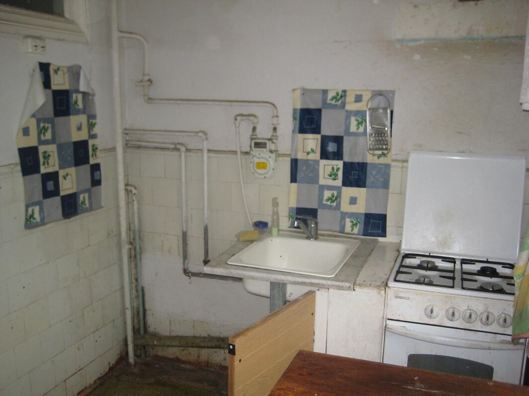 Для удобства и простоты уборки, мы выбрали плиточный пол из бетонной массы. Он визуально напоминает половую доску и идеально гармонирует с полом всей квартиры. Цвет пола подходит и под цвет верхних шкафчиков. Стены и потолки отшпатлеваны и покрашены водоэмульсионной краской для облегчения уборки. Установлена ламинированная кухонная мебель со встроенной газовой плитой, электродуховкой и холодильником. Стены над рабочей поверхностью защищает фартук из закаленного стекла в цвет стен.