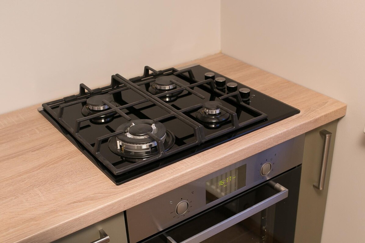 Для того чтобы спрятать страшную газовую трубу, ответвление перенесли ниже уровня кухонной мебели.
