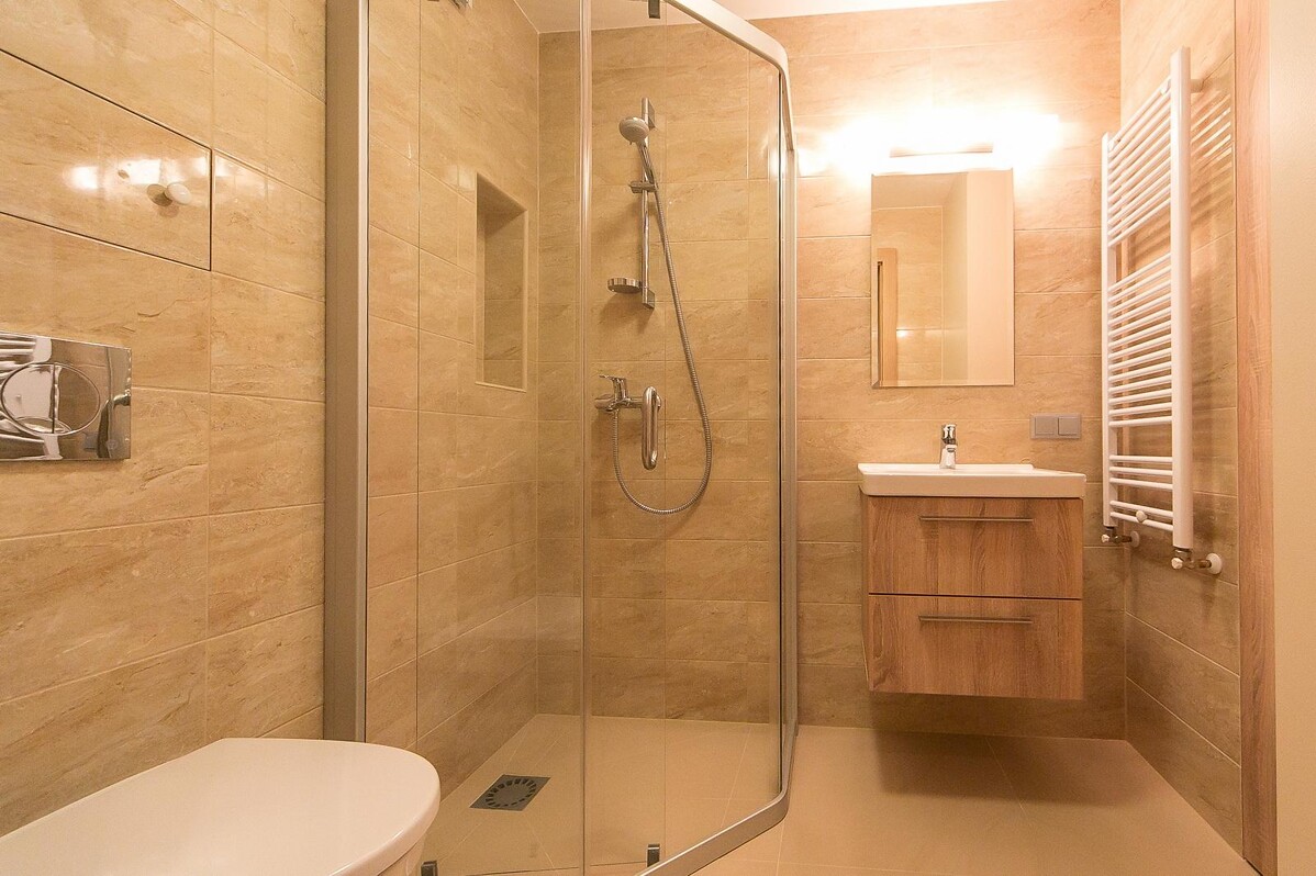 По всей поверхности пола, а также по стенам прилегающим к душевой, произведена гидроизоляция и постелена плитка из бетонной массы, а на стены — глянцевая керамическая плитка. Уход за таким типом поверхностей очень прост, и он прослужит на протяжении долгих лет.