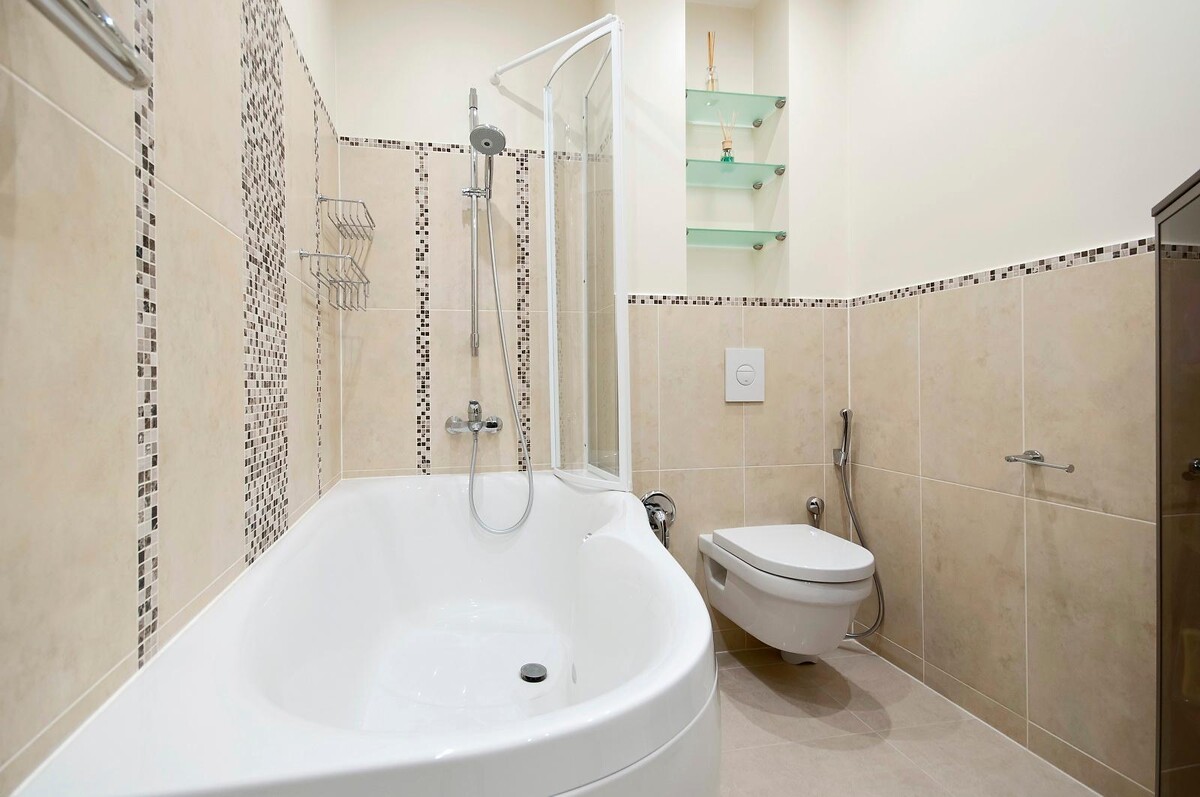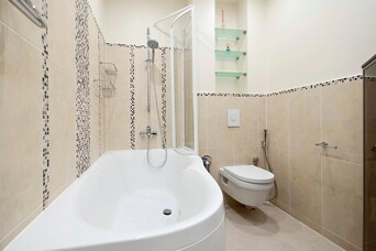 Что может быть приятнее, чем посещение ароматной ванны с солью после трудного рабочего дня? Она снимает напряжение в мышцах, расслабляет и дает ощущение полного умиротворения и гармонии. Если вам позволяет площадь, то мы определенно рекомендуем установку ванны, а не душа, т.к. душ в ванной можно принять всегда, а вот с ванной в душе могут быть проблемы В нашем проекте была поставлена просторная акриловая ванна со складывающейся стенкой. Хоть занавесочка и является более простым решением, она всегда будет смотреться менее опрятно, она хуже просыхает и ее необходимо время от времени менять. Поэтому, в долгосрочной перспективе, стеклянная стенка является более экономичным и надежным решением.